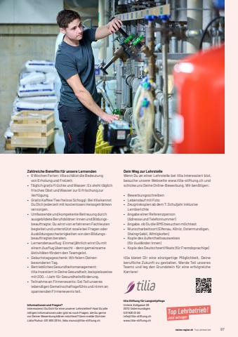 meine-region.ch meine-region.chTop Lehrbetriebe Top Lehrbetrieb 972tilia Stiftung f%u00fcr Langzeitpfl egeUntere%u0009Zollgasse%u0009283072 Ostermundigen031 930 01 00info@tilia-stiftung.chwww.tilia-stiftung.chInformationen und Fragen?Interessierst%u0009Du%u0009Dich%u0009f%u00fcr%u0009eine%u0009unserer%u0009Lehrstellen?%u0009Hast%u0009Du%u0009alle%u0009n%u00f6tigen%u0009Informationen%u0009oder%u0009gibt%u0009es%u0009noch%u0009Fragen,%u0009die%u0009Du%u0009gerne%u0009vor%u0009Deiner%u0009Bewerbung%u0009kl%u00e4ren%u0009m%u00f6chtest?%u0009Dann%u0009melde%u0009Dich%u0009bei%u0009Lidia Mu%u00f1oz: 031 930 33 54, lidia.munoz@tilia-stiftung.chZahlreiche Benefi ts f%u00fcr unsere Lernenden%u2022 6 Wochen Ferien: tilia sch%u00e4tzt die Bedeutung von Erholung und Freizeit.%u2022 T%u00e4glich gratis Fr%u00fcchte und Wasser: Es steht t%u00e4glich frisches Obst und Wasser zur Erfrischung zur Verf%u00fcgung.%u2022 Gratis Kaffee /Tee /heisse Schoggi: Bei tilia kannst Du Dich jederzeit mit kostenlosen Heissgetr%u00e4nken versorgen.%u2022 Umfassende und kompetente Betreuung durch ausgebildete Berufsbildner:innen und Bildungsbeauftragte: Du wirst von erfahrenen Fachleuten begleitet und unterst%u00fctzt sowie bei Fragen oder Ausbildungsschwierigkeiten von den Bildungsbeauftragten beraten.%u2022 Lernendenausfl ug: Einmal j%u00e4hrlich wirst Du mit einem Ausfl ug %u00fcberrascht %u2013 denn gemeinsame Aktivit%u00e4ten f%u00f6rdern den Teamgeist.%u2022 Geburtstagsgeschenk: Wir feiern Deinen besonderen Tag.%u2022 Betriebliches Gesundheitsmanagement:tilia investiert in Deine Gesundheit, beispielsweise mit 200.%u2013 /Jahr f%u00fcr Gesundheitsf%u00f6rderung.%u2022 Teilnahme an Firmenevents: Sei Teil unseres lebendigen Gemeinschaftsgef%u00fchls und nimm an spannenden Firmenevents teil.Dein Weg zur Lehrstelle Wenn Du an einer Lehrstelle bei tilia interessiert bist, besuche unsere Webseite www.tilia-stiftung.ch und schicke uns Deine Online-Bewerbung. Wir ben%u00f6tigen:%u2022 Bewerbungsschreiben%u2022 Lebenslauf mit Foto%u2022 Zeugniskopien ab dem 7. Schuljahr inklusive Lernberichte%u2022 Angabe einer Referenzperson (Adresse und Telefonnummer)%u2022 Angabe, ob Du die BMS besuchen m%u00f6chtest%u2022 Wunscharbeitsort (Elfenau, K%u00f6niz, Ostermundigen, Steingr%u00fcebli, Wittigkofen)%u2022 Kopie des Aufenthaltsausweises (f%u00fcr Ausl%u00e4nder:innen)%u2022 Kopie des Deutschzertifi kats (f%u00fcr Fremdsprachige)tilia bietet Dir eine einzigartige M%u00f6glichkeit, Deine berufl iche Zukunft zu gestalten. Werde Teil unseres Teams und leg den Grundstein f%u00fcr eine erfolgreiche Karriere!
