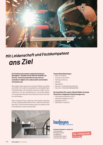104 meine-region.ch Top Lehrbetrieb meine-region.ch Top Lehrbetriebe 1Kaufmann Spenglerei + Sanit%u00e4r AGIm Hanselmaa 68132%u0009Egg%u0009bei%u0009Z%u00fcrich044 986 29 00info@kaufmann-egg.chwww.kaufmann-egg.chMit Leidenschaft und Fachkompetenz ans ZielAls Familienunternehmen steht die Kaufmann Spenglerei + Sanit%u00e4r AG seit 1957 f%u00fcr Qualit%u00e4t und Service. Unsere Kundschaft vertraut auf uns, weshalb wir t%u00e4glich mit Leidenschaft und Herzblut im Einsatz sind.Wir stehen Ihnen gerne mit unserem Wissen zur Seite und helfen mit unseren kompetenten und langj %u00e4hrigen Mitarbeitenden, die optimale L%u00f6sung zu fi nden und zu realisieren. Mit der Ausbildung von Lernenden geben wir jungen Berufsleuten eine Chance f%u00fcr eine Lehrstelle in der Region.Nach unserem Motto %u00abAlles aus einer Hand%u00bb garantieren wir professionellen Service vor, w%u00e4hrend und nach dem Kauf. Die h%u00f6chste Anforderung an uns selbst ist die Zufriedenheit unserer Kundschaft.Unsere Dienstleistungen:%u2022 Bad-Architektur %u2022 Energie und Umwelt%u2022 Heizung /L%u00fcftung%u2022 Sanit%u00e4r%u2022 Spenglerei%u2022 Service + Unterhalt Haustechnik%u2022 Service + Unterhalt Geb%u00e4udeh%u00fclleAls Investition f%u00fcr unsere Zukunft bilden wir junge Menschen in folgenden Fachrichtungen aus:%u2022 Heizungsinstallateur/in EFZ%u2022 Sanit%u00e4rinstallateur/in EFZ%u2022 Spengler/in EFZ%u2022 Kaufmann/-frau EFZ