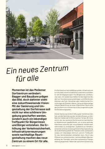 12 meine-region.ch meine-region.ch GemeindenMomentan ist das Meilemer Dorfzentrum ver%u00e4ndert:Bagger und Bauz%u00e4une pr%u00e4gen das Bild, doch dahinter steht eine zukunftsweisende Vision:Mit der Sanierung und Umgestaltung der Dorfstrasse soll nicht nur eine sch%u00f6nere Umgebung geschaffen werden, sondern auch ein lebendiger Treffpunkt f%u00fcr B%u00fcrgerinnen und B%u00fcrger entstehen. Die Erh%u00f6hung der Verkehrssicherheit, Infrastrukturerneuerungen sowie nachhaltige Raumgestaltung machen das neue Zentrum zu einem Ort f%u00fcr alle.Ein Dorfzentrum hat vielf%u00e4ltige soziale, infrastrukturelle, kulturelle und wirtschaftliche Funktionen zu erf%u00fcllen. Es soll ein Begegnungsort f%u00fcr B%u00fcrgerinnen und Besucher sein, mit lokalen Gesch%u00e4ften f%u00fcr den t%u00e4glichen Bedarf zur Grundversorgung beitragen und %u00f6ffentlichen Diensten wie Post, Gemeinde oder medizinischen Einrichtungen als Standort dienen. Genau an diese zeitgem%u00e4ssen Bed%u00fcrfnisse an einen %u00f6ffentlichen Raum wird das Dorfzentrum in Meilen durch die Umgestaltung der Dorfstrasse angepasst. Ziel der Sanierung ist die Erh%u00f6hung der Verkehrssicherheit und die Optimierung des Verkehrsfl usses um den Bahnhof. Neben der Einf%u00fchrung einer Tempo-30-Zone wird in der neu sanierten Dorfstrasse ein barrierefreier Verkehrsraum gew%u00e4hrleistet, um so eine optimale Koexistenz zwischen den verschiedenen Verkehrsteilnehmenden zu erm%u00f6glichen. Zus%u00e4tzlich zur Verkehrssicherheit wird durch eine optimierte Raumgestaltung die Aufenthaltsqualit%u00e4t f%u00fcr Passant:innen verbessert, sodass ein lebendiges Zentrum und ein Treffpunkt f%u00fcr das Gemeindeleben entstehen kann. Durch das Pfl anzen von einheimischen, resistenzf%u00e4hgen B%u00e4umen entlang der Fahrbahn wird eine verbesserte Platzgestaltung angestrebt. Neben der optischen Aufwertung Ein neues Zentrum f%u00fcr alle