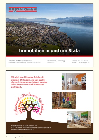 14 meine-region.ch GemeindenPoststrasse 25 %u00b7 8700 K%u00fcsnacht ZH079 410 09 74 %u00b7 kinderhaus@montessori-kuesnacht.chwww.montessori-kuesnacht.chWir sind eine bilinguale Schule mit maximal 24%u00a0Kindern, die von qualifi -zierten Lehrpersonen betreut werden: Alle Lehrpersonen sind Montessori zertifi ziert. ImmobiliendienstleistungenSusanna Eicher Gesch%u00e4ftsf%u00fchrerinVerwaltung%u00b7Verkauf%u00b7ImmobilienbewirtschaftungBrjon GmbHEtzelstrasse 36, Postfach 6108712 St%u00e4faTelefon 044 927 30 40E-Mail s.eicher@brjon.chImmobiliendienstleistungenSusanna Eicher Gesch%u00e4ftsf%u00fchrerinVerwaltung%u00b7Verkauf%u00b7ImmobilienbewirtschBrjon GmbHEtzelstrasse 36, Postfach 6108712 St%u00e4faTelefon 044 927 30 40E-Mail s.eicher@brjon.chImmobilien in und um St%u00e4fabiliendienstleistungenna Eicher Gesch%u00e4ftsf%u00fchrerinung%u00b7Verkauf%u00b7ImmobilienbewirtschaftungGmbHasse 36, Postfach 610%u00e4fa 044 927 30 40s.eicher@brjon.chImmobiliendienstleistungenSusanna Eicher Gesch%u00e4ftsf%u00fchrerinVerwaltung%u00b7Verkauf%u00b7ImmobilienbewirtschaftungBrjon GmbHEtzelstrasse 36, Postfach 6108712 St%u00e4faTelefon 044 927 30 40E-Mail s.eicher@brjon.chImmobiliendienstleistungenSusanna Eicher Gesch%u00e4ftsf%u00fchrerinVerwaltung%u00b7Verkauf%u00b7ImmobilienbewirtschaftungBrjon GmbHEtzelstrasse 36, Postfach 6108712 St%u00e4faTelefon 044 927 30 40E-Mail s.eicher@brjon.chImmobiliendienstleistungenSusanna Eicher Gesch%u00e4ftsf%u00fchrerinVerwaltung%u00b7Verkauf%u00b7ImmobilienbewirtschaftungBrjon GmbHEtzelstrasse 36, Postfach 6108712 St%u00e4faTelefon 044 927 30 40E-Mail s.eicher@brjon.chImmobiliendienstleistungenSusanna Eicher Gesch%u00e4ftsf%u00fchrerinVerwaltung%u00b7Verkauf%u00b7ImmobilienbewirtschaftungBrjon GmbHEtzelstrasse 36, Postfach 6108712 St%u00e4faTelefon 044 927 30 40E-Mail s.eicher@brjon.ch