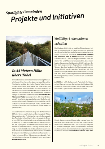 meine-region.ch meine-region.ch Gemeinden 151Spotlights Gemeinden Projekte und InitiativenIn 44 Metern H%u00f6he %u00fcbers TobelWer selbst schon einmal den Panoramaweg Pfannenstiel beschritten hat, weiss, dass man das K%u00fcsnachter Tobel bisher nur %u00fcber den steilen Weg ins Tobel hinunter und auf der anderen Seite wieder das Tobel hinauf passieren konnte. Aber das %u00e4ndert sich nun: Bereits 2018 hatte sich die K%u00fcsnachter Bev%u00f6lkerung mit einer klaren Mehrheit f%u00fcr die Revision des kommunalen Verkehrsrichtplans und damit f%u00fcr den Bau einer Br%u00fccke %u00fcber das K%u00fcsnachter Tobel ausgesprochen. Die neue Br%u00fccke schafft eine Verbindung zwischen den Dorfteilen Allmend und Itschnach. Diese wird nicht wie bisher nur f%u00fcr fi tte und trittsichere Fussg%u00e4nger:innen, sondern auch f%u00fcr %u00e4ltere Menschen und Familien mit Kinderwagen zug%u00e4nglich sein.Die Seilbr%u00fccke wird mit einer L%u00e4nge von 130 Metern rund 50 Meter k%u00fcrzer realisiert als zun%u00e4chst geplant: Mit der %u00dcberarbeitung des Projektes hat man die Schutzziele des Tobels ber%u00fccksichtigt, indem der geplante Standort um 200 Meter tobelaufw%u00e4rts verschoben wurde. Die Br%u00fccke f%u00fcgt sich als schlankes Band in die Landschaft ein, die Zug%u00e4nge zur Br%u00fccke befi nden sich im Wald, erschlossen durch naturnahe Gehwege. Der Baustart erfolgt im Herbst 2025 und die Bauarbeiten dauern voraussichtlich ca. sieben Monate. Am h%u00f6chsten Punkt der Br%u00fccke wird der H%u00f6henunterschied zum Tobel stolze 44 Meter betragen: Diese H%u00f6henmeter werden die Meisten beim Beschreiten der Br%u00fccke wohl nicht vermissen!www.kuesnacht.chVielf%u00e4ltige Lebensr%u00e4ume schaffenDie Biodiversit%u00e4t tr%u00e4gt zu stabilen %u00d6kosystemen bei und ist unverzichtbar f%u00fcr Mensch und Natur. Aus diesem Grund hat die Fachstelle Naturschutz des Kantons Z%u00fcrich im Sommer 2024 eine %u00f6kologische Aufwertung im Gebiet Rain in Meilen realisiert. So werden Lebensr%u00e4ume in Form von Magerwiesen f%u00fcr stark bedrohte Tier- und Pfl anzenarten geschaffen, denn in den letzten Jahrzehnten hat die Artenvielfalt in diesem Gebiet stark abgenommen. Magerwiesen sind bl%u00fchende Wiesen, die nicht landwirtschaftlich genutzt und nur einmal j%u00e4hrlich gem%u00e4ht werden. Verglichen mit Fettwiesen sind Magerwiesen n%u00e4hrstoffarm, was zur Folge hat, dass darauf %u00fcberwiegend konkurrenzschwache Pfl anzen gedeihen, welche ansonsten vom Aussterben bedroht sind.Auf 5200 m2 trifft die kantonale Fachstelle f%u00fcr Naturschutz Massnahmen zur Aufwertung der Biodiversit%u00e4t. Insgesamt sind drei Parzellen vom Projekt betroffen, welche alle Eigentum des Kantons Z%u00fcrich sind. F%u00fcr die Aufwertung der Wiesen tr%u00e4gt man auf etwa der H%u00e4lfte der Fl%u00e4che den n%u00e4hrstoffreichen Oberboden ab, danach wird diese mit Saat- und Schnittgut begr%u00fcnt. So k%u00f6nnen in wenigen Jahren wieder seltene Pfl anzen wachsen und von dieser Vielfalt wiederum profi tiert eine Vielzahl von Insekten. www.zh.ch/de/umwelt-tiere.html