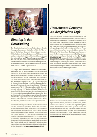 162 meine-region.ch meine-region.ch GemeindenEinstieg in den BerufsalltagDer Berufseinstieg kann herausfordernd sein. Gerade f%u00fcr Jugendliche, denen nicht alles zuf%u00e4llt, die M%u00fche haben in der Schule, die wenig Unterst%u00fctzung vom Umfeld erhalten, ein tiefes Selbstwertgef%u00fchl haben oder schlicht und einfach nicht motiviert sind. Genau da setzt das Integrations- und Pr%u00e4ventionsprogramm LIFT an. Mit dem Ziel, die Sozial- und Selbstkompetenzen, die Berufswahlbereitschaft sowie eine nachhaltige Zusammenarbeit zwischen Schule und Arbeitswelt zu f%u00f6rdern, setzt sich LIFT f%u00fcr die Jugendlichen ein.Die jungen Menschen haben oft bereits F%u00e4higkeiten, welche sie durch LIFT entdecken oder vertiefen k%u00f6nnen. Durch regelm%u00e4ssige Kurzeins%u00e4tze bei lokalen Gewerbebetrieben k%u00f6nnen Jugendliche ab dem 7. Schuljahr erstmals die Luft der Arbeitswelt erschnuppern. Die fr%u00fche Besch%u00e4ftigung mit dem Berufseinstieg ist ein Teil des Erfolges von LIFT. Die Eins%u00e4tze erfolgen in der schulfreien Zeit auf freiwilliger Basis und erlauben den Teilnehmenden, erste praktische Erfahrung zu sammeln. F%u00fcr 2 %u2013 3 Stunden w%u00f6chentlich %u00fcbernehmen sie w%u00e4hrend 6 %u2013 8 Wochen einfache T%u00e4tigkeiten in einem Betrieb. Ihre Leistungen k%u00f6nnen sie sich zudem in einem Arbeitszeugnis best%u00e4tigen lassen. Vor den praktischen Arbeitseins%u00e4tzen in den lokalen Betrieben erhalten die Jugendlichen zudem Modulunterricht, in dem sie unter anderem lernen zu telefonieren, E-Mails zu schreiben, sich zu bewerben und zu pr%u00e4sentieren.Finanziert und organisiert wird die Zusammenarbeit von der lokalen Tr%u00e4gerschaft. Neben der Sekundarschule Meilen sind unter anderem auch Schulen in den Gemeinden Hombrechtikon, St%u00e4fa, Oetwil am See oder K%u00fcsnacht am Projekt beteiligt. Im gesamten Kanton Z%u00fcrich nehmen 100 Schulen am Projekt teil und unterst%u00fctzen dabei insgesamt 788 LIFT-Sch%u00fcler:innen. Schweizweit engagieren sich 400 Schulen und erm%u00f6glichen rund 4000 Jugendlichen wertvolle Erfahrungen. Das Projekt zeigt Erfolg: 60% aller LIFT-Teilnehmenden treten direkt nach Abschluss der obligatorischen Schule eine Berufslehre an. www.jugendprojekt-lift.chGemeinsam Bewegen an der frischen LuftSport ist nicht nur in jungen Jahren essenziell f%u00fcr die Gesundheit und das Wohlbefi nden: auch im Alter ist regelm%u00e4ssige Bewegung mindestens genauso wichtig. Denn ohne Training nimmt die Muskelkraft stetig ab und selbst einfache Bewegungen werden schnell zur M%u00fche. Auch der Kontakt zu anderen Menschen ist ein grundlegendes Bed%u00fcrfnis, das bei %u00e4lteren Personen nicht selten zu kurz kommt. Und jeder weiss: Die Motivation f%u00fcr k%u00f6rperliche Bet%u00e4tigung steigt, wenn man die Anstrengung zusammen mit Gleichgesinnten auf sich nehmen kann. Deshalb vereint das Projekt Z%u00c4MEGOLAUFE, das von der Universit%u00e4t Z%u00fcrich ins Leben gerufen wurde, die Aspekte sozialer Gemeinschaft und Bewegung. Das Projekt soll die k%u00f6rperliche Aktivit%u00e4t bei %u00e4lteren Menschen f%u00f6rdern und durch die regelm%u00e4ssige Bewegung und die sozialen Kontakte dazu beitragen, l%u00e4nger unabh%u00e4ngig zu bleiben.Foto:Z%u00c4MEGOLAUFE%u0009c/o%u0009RADIXBereits 22 Gemeinden im ganzen Kanton Z%u00fcrich beteiligen sich am Projekt, darunter auch K%u00fcsnacht, St%u00e4fa, Zollikon und Zumikon. So treffen sich regelm%u00e4ssig Menschen %u00fcber 60 Jahren zum %u00abZ%u00e4me go laufe%u00bb, wie es der Projektname so sch%u00f6n sagt. Das kann mal ein leichter, kurzer Spaziergang sein, mal ein anspruchsvollerer Marsch von 10 Kilometern L%u00e4nge. Die aktuelle Agenda ist jeweils auf der Webseite der Gemeinden einzusehen. www.z%u00e4megolaufe.ch