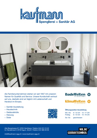 Alte Bergstrasse 91 | 8704 Herrliberg | Telefon 044 915 10 22Im Hanselmaa 6 | 8132 Egg b. Z%u00fcrich | Telefon 044 986 29 00info@kaufmann-egg.ch | www.kaufmann-egg.chAls Familienunternehmen stehen wir seit 1957 mit unserem Namen f%u00fcr Qualit%u00e4t und Service. Unsere Kundschaft vertraut auf uns, deshalb sind wir t%u00e4glich mit Leidenschaft und Herzblut im Einsatz.%u2013 Sanit%u00e4r-Ausstellung%u2013 Haustechnik%u2013 Geb%u00e4udeh%u00fclle%u2013 Heizung%u2013 Solar%u00d6ffnungszeiten AusstellungMo %u2013 Do 9 %u2013 12 Uhr 13 %u2013 17 UhrFreitag 9 %u2013 12 Uhr 13 %u2013 16 UhrSa %u2013 So geschlossen