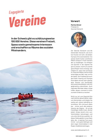 meine-region.ch meine-region.ch Vereine 231VorwortMartina SintzelPr%u00e4sidentinSeeclub K%u00fcsnachtDer Seeclub K%u00fcsnacht und die Gemeinden K%u00fcsnacht und Zumikon freuten sich sehr, die beiden Olympia-Bronzemedaillen-Gewinner Andrin Gulich und Roman R%u00f6%u00f6sli zuhause in Ihren Gemeinden zu empfangen. So erfolgreiche Sportler in der eigenen Region zu wissen, macht uns und die ganze Region stolz und zeigt, was m%u00f6glich ist, wenn man mit Disziplin, eisernem Willen und Durchhalteverm%u00f6gen am Ball, resp. am Ruder bleibt. Der Empfang wie auch das Public Viewing zum Olympiafi nal haben einmal mehr gezeigt, dass Vereine und Gemeinden eng zusammenarbeiten und sich gegenseitig unterst%u00fctzen. Auch regionale Betriebe haben mitgeholfen, diesen %u00abmoment in time%u00bb zu einem Erlebnis zu machen!Nicht nur wir vom Seeclub K%u00fcsnacht d%u00fcrfen darauf z%u00e4hlen, dass uns Gemeinden und lokales Gewerbe seit Jahren tatkr%u00e4ftig unterst%u00fctzen. Wir sind auch dankbar %u2013 sicher auch alle anderen Vereine der Region - f%u00fcr all die freiwilligen Helfer:innen, die bei jedem Anlass bereit sind, zum Vereinsleben beizutragen und uns unter die Arme zu greifen. An dieser Stelle geb%u00fchrt unser Dank allen, die - in welcher Form auch immer - zum guten Gelingen und dem regen Vereinsleben in der Region Goldk%u00fcste beitragen.www.seeclubkuesnacht.chVereineEngagierteIn der Schweiz gibt es sch%u00e4tzungsweise 100 000 Vereine. Diese vereinen Freizeit, Spass sowie gemeinsame Interessen und erschaffen so R%u00e4ume des sozialen Miteinanders.