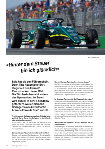 241 meine-region.ch meine-region.ch Spitzensportlerin Jungtalent%u00abHinter dem Steuer bin ich gl%u00fccklich%u00bbBald hat sie den F%u00fchrerschein. Doch Tina Hausmann f%u00e4hrt l%u00e4ngst auf den Formel 1 Rennstrecken dieser Welt. Die Z%u00fcrcherin besucht zudem das Gymnasium. Ihr Talent wird aktuell in der F1 Academy gef%u00f6rdert, wo sie niemand Geringeren als Aston Martin Aramco Formula One%u00ae vertritt. Frau Hausmann, Sie haben gerade Ihren 18. Geburtstag gefeiert. Waren Sie zu dem Zeitpunkt in der Schweiz oder auf einer Rennstrecke?Endlich 18! Es war toll. Zwischen den Rennen in Singapur und einem Training in Abu Dhabi war ich in der Schweiz und konnte mit meiner Familie und meinen Freunden feiern. Dann steht dem F%u00fchrerschein nichts mehr im Weg? Das war mein grosses Ziel. Aus diesem Grund habe ich gleich nach meinem 17. Geburtstag alles vorbereitet, um die einj%u00e4hrige Laufzeit f%u00fcr den Lernfahrausweis beginnen zu k%u00f6nnen. Werden Sie noch Fahrstunden nehmen m%u00fcssen? Das Fahren im Alltagsverkehr ist ganz anders als auf der Rennstrecke. Doch es macht mir genau so viel Spass. Es ist ungewohnt, da ich mich an die vielen neuen Regeln gew%u00f6hnen muss. Deshalb werde ich bestimmt einige Fahrlektionen nehmen. Das R%u00fcckw%u00e4rtsfahren und das seitliche Einparkieren sind neu f%u00fcr mich. Ist Ihnen der Rennsport in die Wiege gelegt worden? Ich komme nicht aus einer Motorsportfamilie, wie es bei den meisten meiner Kolleginnen und Kollegen auf der Rennstrecke der Fall ist. Meine Begeisterung f%u00fcr den Rennsport verdanke ich einem Zufall. Als ich sieben Jahre alt war, begleitete ich meine Eltern zu einem Autoh%u00e4ndler. Dort war ein Kart ausgestellt, und ich wurde magisch angezogen. Das Kartfahren und entsprechende Rennen waren der Grundstein f%u00fcr meinen aktuellen Weg.Wof%u00fcr steht der Rennsport f%u00fcr Sie? Was reizt Sie am Traum Formel 1? Der Motorsport ist vielseitig, mehr als man denken w%u00fcrde. Ich liebe die Geschwindigkeit und die enorme Beschleunigung. Man ben%u00f6tigt Kraft und Ausdauer. Dazu kommt das mentale Training, die Konzentration und die Analyse der technischen Daten. Ich trainiere oft im Simulator. Der Rennsport ist meine Passion. Hinter dem Steuer bin ich gl%u00fccklich.Text: Claudia Hutter
