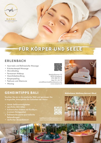 32 meine-region.ch Vereine F%u00dcR K%u00d6RPER UND SEELE%u2022 Ayurveda und Balinesische Massage%u2022 Kr%u00e4uterstempel-Massage%u2022 Microblading%u2022 Permanent Makeup%u2022 Gesichtsbehandlung%u2022 K%u00f6rperpeeling%u2022 Pedicure und Manicure%u2022 Waxing%u2022 lokale Sehensw%u00fcrdigkeiten%u2022 sportliche Aktivit%u00e4ten%u2022 kulinarisches Erlebnis mit Kochkurs in einem K%u00f6nigspalast%u2022 balinesische sowie ayurvedische Behandlungen%u2022 idyllischer AussenbereichGEHEIMTIPPS BALIBahnhofstrasse 338703 Erlenbach076 588 90 18044 911 03 70swiss@marniwellnessbeauty.comwww.mmarni.chbali@marniwellnessbeauty.com www.marniwellnessbeauty.comERLENBACHTauchen Sie ein in die exotische Welt und geniessen Sie in tropischer Atmosph%u00e4re die Sch%u00f6nheit der Natur.Mahottama Wellness Retreat Ubud