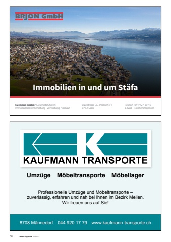 36 meine-region.ch VereineImmobiliendienstleistungenSusanna Eicher Gesch%u00e4ftsf%u00fchrerinVerwaltung%u00b7Verkauf%u00b7ImmobilienbewirtschaftungBrjon GmbHEtzelstrasse 36, Postfach 6108712 St%u00e4faTelefon 044 927 30 40E-Mail s.eicher@brjon.chImmobiliendienstleistungenSusanna Eicher Gesch%u00e4ftsf%u00fchrerinVerwaltung%u00b7Verkauf%u00b7ImmobilienbewirtschBrjon GmbHEtzelstrasse 36, Postfach 6108712 St%u00e4faTelefon 044 927 30 40E-Mail s.eicher@brjon.chImmobilien in und um St%u00e4fabiliendienstleistungenna Eicher Gesch%u00e4ftsf%u00fchrerinung%u00b7Verkauf%u00b7ImmobilienbewirtschaftungGmbHasse 36, Postfach 610%u00e4fa 044 927 30 40s.eicher@brjon.chImmobiliendienstleistungenSusanna Eicher Gesch%u00e4ftsf%u00fchrerinVerwaltung%u00b7Verkauf%u00b7ImmobilienbewirtschaftungBrjon GmbHEtzelstrasse 36, Postfach 6108712 St%u00e4faTelefon 044 927 30 40E-Mail s.eicher@brjon.chImmobiliendienstleistungenSusanna Eicher Gesch%u00e4ftsf%u00fchrerinVerwaltung%u00b7Verkauf%u00b7ImmobilienbewirtschaftungBrjon GmbHEtzelstrasse 36, Postfach 6108712 St%u00e4faTelefon 044 927 30 40E-Mail s.eicher@brjon.chImmobiliendienstleistungenSusanna Eicher Gesch%u00e4ftsf%u00fchrerinVerwaltung%u00b7Verkauf%u00b7ImmobilienbewirtschaftungBrjon GmbHEtzelstrasse 36, Postfach 6108712 St%u00e4faTelefon 044 927 30 40E-Mail s.eicher@brjon.chImmobiliendienstleistungenSusanna Eicher Gesch%u00e4ftsf%u00fchrerinVerwaltung%u00b7Verkauf%u00b7ImmobilienbewirtschaftungBrjon GmbHEtzelstrasse 36, Postfach 6108712 St%u00e4faTelefon 044 927 30 40E-Mail s.eicher@brjon.chProfessionelle Umz%u00fcge und M%u00f6beltransporte %u2013 zuverl%u00e4ssig, erfahren und nah bei Ihnen im Bezirk Meilen.Wir freuen uns auf Sie!Umz%u00fcge M%u00f6beltransporte M%u00f6bellager 8708 M%u00e4nnedorf 044 920 17 79 www.kaufmann-transporte.ch