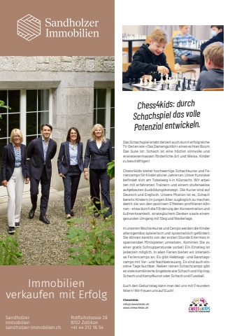 403 meine-region.ch meine-region.ch VereineDas Schachspiel erlebt derzeit auch durch erfolgreiche TV-Serien wie %u00abDas Damengambit%u00bb einen echten Boom. Das Gute ist: Schach ist eine h%u00f6chst sinnvolle und erwiesenermassen f%u00f6rderliche Art und Weise, Kinder zu besch%u00e4ftigen!Chess4kids bietet hochwertige Schachkurse und Feriencamps f%u00fcr Kinder ab vier Jahren an. Unser Kurslokal befi ndet sich am Tobelweg 4 in K%u00fcsnacht. Wir arbeiten mit erfahrenen Trainern und einem stufenweise aufgebauten Ausbildungskonzept. Die Kurse sind auf Deutsch und Englisch. Unsere Mission ist es, Schach bereits Kindern im jungen Alter zug%u00e4nglich zu machen, damit sie von den positiven Effekten profi tieren k%u00f6nnen %u2013 etwa durch die F%u00f6rderung der Konzentration und Aufmerksamkeit, strategischem Denken sowie einem gesunden Umgang mit Sieg und Niederlage.In unseren Wochenkurse und Camps werden die Kinder altersgem%u00e4ss spielerisch und systematisch gef%u00f6rdert. Sie k%u00f6nnen bereits von der ersten Stunde Erlerntes in spannenden Minispielen umsetzen. Kommen Sie zu einer gratis Schnupperstunde vorbei! Ein Einstieg ist jederzeit m%u00f6glich. In allen Ferien bieten wir interaktive Feriencamps an. Es gibt Halbtags- und Ganztagscamps mit Vor- und Nachbetreuung. Es sind auch einzelne Tage buchbar. Neben reinen Schachcamps gibt es viele kombinierte Angebote wie Schach und Hip Hop, Schach und Kampfkunst oder Schach und Fussball.Auch den Geburtstag kann man bei uns mit Freunden feiern! Wir freuen uns auf Euch!Chess4kids info@chess4kids.chwww.chess4kids.chChess4kids: durch Schachspiel das volle Potenzial entwickeln.Inserat halbseitig, 101 x 297 mmSandholzerImmobiliensandholzer-immobilien.chRotfluhstrasse 288702 Zollikon+41 44 212 18 54 Immobilienverkauf en mit Erfolg