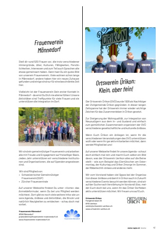 meine-region.ch Vereine 41meine-region.ch Vereine 4Der Ortsverein %u00dcrikon (OV%u00dc) wurde 1928 als Nachfolger der Zivilgemeinde %u00dcrikon gegr%u00fcndet. In dieser langen Zeitspanne hat der Ortsverein immer wieder wichtige Zeichen f%u00fcr das Zusammenleben in %u00dcrikon gesetzt.Zur Steigerung der Wohnqualit%u00e4t, zur Integration von Neuzuz%u00fcgern aus dem In- und Ausland und einfach zum gem%u00fctlichen Zusammensein organisiert der OV%u00dc verschiedene gesellschaftliche und kulturelle Anl%u00e4sse. Wenn Euch %u00dcrikon ein Anliegen ist, wenn Ihr die verschiedenen Veranstaltungen des OV%u00dc unterst%u00fctzen wollt oder wenn Ihr gar aktiv mitarbeiten m%u00f6chtet, dann werdet Mitglied bei uns!Auf unserer Webseite fi ndet Ihr unsere Agenda %u2013 schaut doch einfach mal rein und macht Euch selbst ein Bild davon, was der Ortsverein Uerikon alles auf die Beine stellt %u2013 wie zum Beispiel das Eiert%u00fctschen am Ostermontag, der Kulturtag und %u00dcriker Zmorge im Sommer, der R%u00e4beliechtli-Anlass und anderes mehr.Wir vom Vorstand haben viel Spass bei der Organisation dieser Anl%u00e4sse und damit in %u00dcrikon auch in Zukunft verschiedene Events besucht werden k%u00f6nnen, sind wir auf der Suche nach Verst%u00e4rkung im Vorstand! Also, meldet Euch doch bei uns, wenn Ihr das %u00dcriker Dorfl eben aktiv unterst%u00fctzen m%u00f6chtet. Wir freuen uns auf Euch.Ortsverein %u00dcrikonFangenstrasse 208713%u0009Uerikonverein@ortsverein-uerikon.chwww.ortsverein-uerikon.chOrtsverein %u00dcrikon: Klein, aber fein!Frauenverein M%u00e4nnedorfStell dir rund 530 Frauen vor, die trotz verschiedener Hintergr%u00fcnde, Alter, Kulturen, F%u00e4higkeiten, Pers%u00f6nlichkeiten, Interessen und zum Teil auch Sprachen alle etwas gemeinsam haben. Dann hast Du ein gutes Bild von unserem Frauenverein. Viele wohnen schon lange in M%u00e4nnedorf, andere haben hier ein neues Zuhause gefunden und einige sind nur f%u00fcr eine beschr%u00e4nkte Zeit hier.Vielleicht ist der Frauenverein Dein erster Kontakt in M%u00e4nnedorf - da wirst Du Dich nie alleine f%u00fchlen! Unsere Aktivit%u00e4ten sind Treffpunkte f%u00fcr viele Frauen und sie unterst%u00fctzen die Integration im Dorf.Wir sind ein gemeinn%u00fctziger Frauenverein und arbeiten alle mit Freude und Engagement auf freiwilliger Basis. Jedes Jahr unterst%u00fctzen wir verschiedene Institutionen und Organisationen, die auf Spenden angewiesen sind. Wir sind Mitglied von:%u2022 Schweizerischer Gemeinn%u00fctziger Frauenverein (SGF) %u2022 Z%u00fcrcher Frauenzentrale Auf unserer Webseite fi ndest Du unter %u00abHome%u00bb das Anmeldeformular, wenn Du bei uns Mitglied werden m%u00f6chtest. Dort gibt es noch viele weitere Infos wie unsere Agenda, Anl%u00e4sse und Aktivit%u00e4ten, die Brocki und nat%u00fcrlich Neuigkeiten zu entdecken - schau doch mal vorbei.Frauenverein M%u00e4nnedorf 8708 M%u00e4nnedorfpraesidentin@frauenverein-maennedorf.ch www.frauenverein-maennedorf.ch