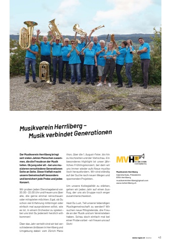 meine-region.ch meine-region.ch Vereine 431Musikverein Herrliberg %u2013 Musik verbindet GenerationenDer Musikverein Herrliberg bringt seit vielen Jahren Menschen zusammen, die die Freude an der Musik teilen. Ob jung oder alt %u2013 bei uns musizieren verschiedene Generationen Seite an Seite. Diese Vielfalt macht unsere Gemeinschaft besonders und bereichert jede Probe und jedes Konzert.Wir proben jeden Dienstagabend von 20.00 - 22.00 Uhr und freuen uns %u00fcber alle, die gerne einmal reinschauen oder mitspielen m%u00f6chten. Egal, ob Du schon viel Erfahrung mitbringst oder einfach mal ausprobieren willst, wie es ist, in einem Orchester zu spielen %u2013bei uns bist Du jederzeit herzlich willkommen!%u00dcber das Jahr verteilt sind wir bei verschiedenen Anl%u00e4ssen in Herrliberg und Umgebung dabei: vom Z%u00fcrich Marathon, %u00fcber die 1. August-Feier, bis hin zu Hochzeiten und der Viehschau. Ein besonderes Highlight ist unser j%u00e4hrliches Fr%u00fchlingskonzert, bei dem wir uns immer wieder aufs Neue musikalisch herausfordern. Wir sind st%u00e4ndig auf der Suche nach neuen Wegen und spannenden Projekten.Um unsere Kollegialit%u00e4t zu st%u00e4rken, gehen wir jedes Jahr auf einen Ausfl ug, der uns als Gruppe noch enger zusammenschweisst.Hast Du Lust, Teil unserer lebendigen Musikgemeinschaft zu werden? Wir suchen neue Mitspielende, die Freude an der Musik und am Vereinsleben haben. Schau doch einfach mal bei einer Probe vorbei %u2013 wir freuen uns auf Dich!Musikverein HerrlibergGabriela Dubs, Pr%u00e4sidentin8704 Herrlibergmusikvereinherrliberg@gmail.comwww.mvherrliberg.ch