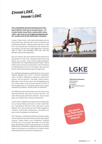 meine-region.ch meine-region.ch Vereine 491Einmal LGKE, immer LGKEDie Leichtathletik Gemeinschaft K%u00fcsnacht-Erlenbach (LGKE) ist mehr als nur ein Sportverein %u2013 sie ist eine Familie. Unser Motto %u00abeinmal LGKE, immer LGKE%u00bb steht nicht nur f%u00fcr langj %u00e4hrige Mitgliedschaften, sondern auch f%u00fcr den besonderen Teamgeist. Unsere Trainer:innen, viele selbst ehemalige oder aktive Athlet:innen, betreuen das Team mit Herzblut und auf h%u00f6chstem Niveau %u2013 egal ob Amateursportler:in oder Profi . Auch abseits der Tartanbahn ist der Zusammenhalt sp%u00fcrbar und wird durch das allj%u00e4hrliche Trainingslager in Italien, das legend%u00e4re LGKE-Fest oder das beliebte Chlaustraining gest%u00e4rkt. Bei uns trainiert der leistungsorientierte Nachwuchs gemeinsam mit der Elite, und genau diese Mischung macht uns so stark. Trotz unserer %u00fcberschaubaren Gr%u00f6sse feiern wir regelm%u00e4ssig grosse Erfolge: Unsere Athlet:innen mischen auf nationalen und internationalen Wettk%u00e4mpfen vorne mit und zeigen, dass auch ein kleiner Verein Spitzenleistungen erbringen kann. Die vielf%u00e4ltige Begeisterungsf%u00e4higkeit f%u00fcr die Leichtathletik spiegelt sich auch in unseren Disziplinen wider: Ob Sprint, Weitsprung, Speerwurf oder Hochsprung %u2013 bei uns heisst es: %u00abschneller, weiter, h%u00f6her.%u00bb Besonders stolz sind wir auch, wie die Begeisterung f%u00fcr unseren Sport in der Schweiz seit der EM 2014 in Z%u00fcrich gewachsen ist. Schweizer Athlet:innen sorgen weltweit f%u00fcr Aufsehen, und die LGKE ist mittendrin!Seit 1978 bietet die LGKE Kindern ab acht Jahren eine sportliche Heimat. Ob in der LA-Schule, den U12-, U14- oder U16-Gruppen oder bei den Aktiven %u2013 bei uns kann jede:r seine sportlichen Tr%u00e4ume verwirklichen.Unsere LGKE-Highlights und sportlichen Erfolge teilen wir auf Social Media und freuen uns %u00fcber viele Follower. Interessierte Sportler:innen, aber auch Leichtathletik-Fans, die sich gerne in der LGKE engagieren m%u00f6chten, sind herzlich willkommen und d%u00fcrfen uns gerne unter info@lgke.ch kontaktieren.Der Trainings- und Wettkampfbetrieb erfordert neben hohem zeitlichen Aufwand sowie grossem Sportsgeist unseres Trainer-Teams auch erhebliche fi nanzielle Mittel. Es ist uns wichtig, die Kosten f%u00fcr Trainingslager, Bekleidung, Fahrten zu Meetings etc. f%u00fcr unsere Athletinnen und Athleten m%u00f6glichst niedrig zu halten. Daher sind Sponsoren und G%u00f6nner f%u00fcr unseren Verein %u00fcberlebenswichtig und herzlich willkommen!LGKE K%u00fcsnacht-Erlenbach8703 Erlenbachinfo@lgke.chwww.lgke.ch%u0009%u0009%u0009%u0009%u0009%u0009%u0009%u0009LGKuesnachtErlenbach lgke_Jetzt unseren Social Media-Kan%u00e4len folgen und nichts verpassen!