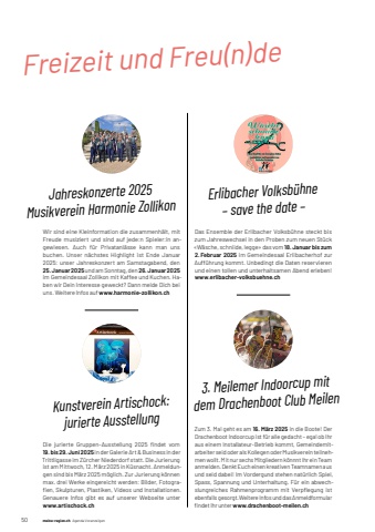 501 meine-region.ch meine-region.ch Agenda Voranzeigen VereineFreizeit und Freu (n) de Jahreskonzerte 2025Musikverein Harmonie ZollikonKunstverein Artischock:jurierte AusstellungErlibacher Volksb%u00fchne%u2013 save the date %u2013Wir sind eine Kleinformation die zusammenh%u00e4lt, mit Freude musiziert und sind auf jede:n Spieler:in angewiesen. Auch f%u00fcr Privatanl%u00e4sse kann man uns buchen. Unser n%u00e4chstes Highlight ist Ende Januar 2025: unser Jahreskonzert am Samstagabend, den 25. Januar%u00a02025 und am Sonntag, den 26. Januar 2025 im Gemeindesaal Zollikon mit Kaffee und Kuchen. Haben wir Dein Interesse geweckt? Dann melde Dich bei uns. Weitere Infos auf www.harmonie-zollikon.chDas Ensemble der Erlibacher Volksb%u00fchne steckt bis zum Jahreswechsel in den Proben zum neuen St%u00fcck %u00abW%u00e4sche, schniide, legge%u00bb das vom 18. Januar bis zum 2. Februar 2025 im Gemeindesaal Erlibacherhof zur Auff%u00fchrung kommt. Unbedingt die Daten reservieren und einen tollen und unterhaltsamen Abend erleben! www.erlibacher-volksbuehne.chDie jurierte Gruppen-Ausstellung 2025 fi ndet vom 19. bis 29. Juni 2025 in der Galerie Art & Business in der Trittligasse im Z%u00fcrcher Niederdorf statt. Die Jurierung ist am Mittwoch, 12. M%u00e4rz 2025 in K%u00fcsnacht. Anmeldungen sind bis M%u00e4rz 2025 m%u00f6glich. Zur Jurierung k%u00f6nnen max. drei Werke eingereicht werden: Bilder, Fotografi en, Skulpturen, Plastiken, Videos und Installationen. Genauere Infos gibt es auf unserer Webseite unterwww.artischock.ch3. Meilemer Indoorcup mit dem Drachenboot Club MeilenZum 3. Mal geht es am 16. M%u00e4rz 2025 in die Boote! Der Drachenboot Indoorcup ist f%u00fcr alle gedacht %u2013 egal ob Ihr aus einem Installateur-Betrieb kommt, Gemeindemitarbeiter seid oder als Kollegen oder Musikverein teilnehmen wollt. Mit nur sechs Mitgliedern k%u00f6nnnt Ihr ein Team anmelden. Denkt Euch einen kreativen Teamnamen aus und seid dabei! Im Vordergund stehen nat%u00fcrlich Spiel, Spass, Spannung und Unterhaltung. F%u00fcr ein abwechslungreiches Rahmenprogramm mit Verpfl egung ist ebenfalls gesorgt.Weitere Infos und das Anmeldformular fi ndet Ihr unter www.drachenboot-meilen.ch