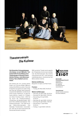 meine-region.ch meine-region.ch Vereine 531Theaterverein Die Kulisse Die K%u00fcsnachter Schauspielgruppe %u00abDie Kulisse%u00bb ist seit 1988 aktiv. Treibende Kr%u00e4fte f%u00fcr die Bildung einer Theatergruppe in K%u00fcsnacht waren G%u00fcnther Schoop, Jutta G%u00fctermann Schoop, Marco Badilatti und Lilo Rieder.Die Kulisse war mit %u00abUnsere kleine Stadt%u00bb von Thornton Wilder 1988 erstmals auf der B%u00fchne zu sehen. Die erste Produktion war gleich ein voller Erfolg. Der Elan der Gr%u00fcnder fand Unterst%u00fctzung bei den Beh%u00f6rden und die Gunst eines treuen Publikums, so dass bis heute j%u00e4hrlich, jeweils im Fr%u00fchjahr, ein St%u00fcck Premiere feiert. 2010 fi el sie durch die Theaterproduktion %u00abZiitspr%u00fcng%u00bb als Wandertheater, 2012 durch die Jubil%u00e4umsproduktion %u00abDie Dreigroschenoper%u00bb und 2018 durch das %u00abReformationsprojekt%u00bb %u00abDie Gebr%u00fcder Fleckenstein%u00bb besonders auf. 2011 hat sie den Kulturpreis der Gemeinde K%u00fcsnacht erhalten.1992 wurde der Theaterverein gegr%u00fcndet. Mitglied des Vereins kann werden, %u00abwer die Bestrebungen des Vereins unterst%u00fctzen will%u00bb (Art. 4 der Statuten), unabh%u00e4ngig davon, ob jemand auf der B%u00fchne stehen m%u00f6chte.N%u00e4chste Auff%u00fchrung:Biografi e: Ein Spiel, von Max FrischPremiere%u2022 Freitag, 28. M%u00e4rz 2025, 19.30 Uhr Weitere Auff%u00fchrungen %u2022 Samstag, 29. M%u00e4rz 2025, 19.30 Uhr%u2022 Sonntag, 30. M%u00e4rz 2025, 17.00 Uhr%u2022 Donnerstag, 03. April 2025, 19.30 Uhr%u2022 Samstag, 05. April 2025, 19.30 Uhr%u2022 Sonntag, 06. April 2025, 17.00 Uhr%u2022 Donnerstag, 10. April 2025, 19.30 Uhr%u2022 Freitag, 11. April 2025, 19.30 UhrDIE KULISSESchauspielgruppe K%u00fcsnachtG%u00fcstrasse 68700%u0009K%u00fcsnacht077 495 80 39kontakt@kulisse.chwww.kulisse.chVeranstaltungenAktuelle Termine entnehmen Sie%u0009unserer%u0009Webseite.Ensemble der Theaterproduktion %u00abParzival%u00bb von Lukas B%u00e4rfuss, aufgef%u00fchrt im M%u00e4rz 2024.Nach%u0009dem%u0009Versroman%u0009von%u0009Wolfram%u0009von%u0009Eschenbach.Regie: David Edmond