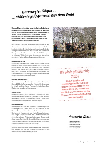 meine-region.ch meine-region.ch Vereine 571 Oetenwyler Clique %u2026%u2026 gf%u00fc%u00fcrchigi Kreaturen aus dem WaldUnsere Clique hat mit der urspr%u00fcnglichen Bedeutung der Krampusse als Begleiter des heiligen St.Nikolaus am 06. Dezember (Knecht Ruprecht, Schmutzli, etc.) nichts zu tun. Vom Sinn und Tun ist unser Treiben eher bei den Perchten oder den Schiachperchten einzuordnen. Jedoch, dass wir uns nicht nur in den Raun%u00e4chten (im Januar) herumtreiben. Wir sind mit unserem Auftreten dem Bruchtum der alemannischen Fasnacht zuzurechnen. Unser Treiben beginnt mit dem Dreik%u00f6nigstag und endet zum Ende der evangelischen Fasnacht. Wir nennen uns auch nicht Krampusse oder Perchten, wir sind die Gf%u00fc%u00fc%u00fcrchigen vo Oetenwyl. Wir treiben unser Unwesen an Fasnachtsumz%u00fcgen, Maskenb%u00e4llen, Beizenfasnachten etc.Unsere GeschichteEs geht die M%u00e4r, dass sich %u00abgf%u00fc%u00fcrchigi%u00bb Kreaturen aus dem Wald beim H%u00fc%u00fcsli herumtreiben. Man sagt, sie seien verdammt, auf ewig den See zu suchen, den Oetwil nicht hat. Weiter wird gemunkelt, dass auch schon mal junge Leute dort im wabernden Morgennebel verschw%u00e4nden, als %u00abGf%u00fc%u00fcrchigi%u00bb wieder auftauchen und ewig ihr Unwesen treiben m%u00fcssen %u2026Unsere GeburtswehenGeboren aus einer Bieridee (wie so oft) im Jahre des Herrn 2009, als Rettungsanker f%u00fcr den Kinderumzug in Oetwil am See. Vater: Feuerwehr Oetwil am See, Mutter: war gerade nicht anwesend.Unser WagenUnser Cliquenfahrzeug stellt das %u00abSumpfh%u00fc%u00fcsli vom Bolligerweiher%u00bb in Oetwil dar, gezogen von der absolut verr%u00fcckten Kuh mit ihrem ewigen Reiter. Unterst%u00fctzt durch die gf%u00fc%u00fc%u00fcrchige Musik, die uns umgibt.Unsere Kost%u00fcmeUnsere Kost%u00fcme sind den Perchten oder Krampussen nachempfunden. Jedes H%u00e4%u00e4s der Gf%u00fc%u00fcrchigen ist ein Unikat. Bestehend aus einem bodenlangen schwarzen Umhang mit Kapuze, mit viel Naturfellapplikationen aus Ziege, Kuh, Kaninchen etc. %u2013 mittlerweilen aus einem Ganzk%u00f6rper-Fellanzug. Ketten zum Rasseln und die grossen Schellen f%u00fcr den gf%u00fc%u00fcrchigen L%u00e4rm sowie viele schaudernde Kleinigkeiten und/oder Troph%u00e4enst%u00e4be mit Geweih sind immer mit dabei.Unsere Masken sind vorwiegend aus Holz geschnitzt und werden zum Teil von unseren Mitgliedern in aufwendiger Handarbeit selber gestaltet.Oetenwyler CliqueGl%u00e4rnischstrasse 548618 Oetwil am Seeinfo@oetenwyler.ch%u0009www.oetenwyler.chWo wirds gf%u00fc%u00fc%u00fc%u00fcrchig 2025?Unter Termine auf unserer Webseite fi ndet Ihr unsere Umzugsdaten f%u00fcr die Saison 2025. Wir freuen uns auf Dich als Zuschauer an der Strasse oder auch als Gast mit uns am Umzug!
