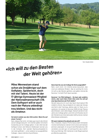 601 meine-region.ch meine-region.ch Jungtalent%u00abIch will zu den Besten der Welt geh%u00f6ren%u00bbMiles Wennestam stand schon als Dreij %u00e4hriger auf dem Golfplatz. Spielerisch, doch mit viel Talent. Heute ist der 17- j%u00e4hrige Gymnasiast Mitglied der Nationalmannschaft U18. Dem Golfsport will er auch nach der Matura unbedingt treu bleiben. Und das nicht als Amateur.Du kamst soeben aus den USA zur%u00fcck. Warst Du auf einem Turnier?Nein, dieses Mal nicht. Ich habe quer durch die USA diverse Colleges besucht. Ich m%u00f6chte sp%u00e4ter mit einem Scolarship auf ein College gehen. In den USA hat der Golfsport einen viel h%u00f6heren Stellenwert als bei uns in der Schweiz. Dort werden Nachwuchsspieler:innen stark gef%u00f6rdert %u2013 unter anderem an ausgew%u00e4hlten Colleges %u2013 davon m%u00f6chte ich profi tieren. Dann hast Du nun ein College f%u00fcr Dich ausgew%u00e4hlt?Nein, noch nicht. Ich m%u00f6chte jenes besuchen, das mich am st%u00e4rksten f%u00f6rdert. Das ist wichtig f%u00fcr mich. Ich will zu den Besten geh%u00f6ren und sp%u00e4ter einmal die Nummer 1 im Golf-Profi -Sport werden. Nummer 1 im PGA Golfsport %u2013 Du hast sehr ambitionierte, aber auch klare Ziele! Also setzt Du voll auf eine Sportkarriere als Profi -Golfer? Derzeit besuche ich noch das Sport-Gymnasium R%u00e4mib%u00fchl in Z%u00fcrich. Das erm%u00f6glicht mir nebst der Schule viel Zeit in die Trainings, alleine oder im Team, zu investieren. Ich werde im Sommer 2026 mit der Matura abschliessen, wenn alles klappt. Danach werde ich vier Jahre ans College gehen und mich schrittweise durch die Teilnahme an internationalen Golfturnieren meiner Altersklasse verbessern. Mit wem trainierst Du aktuell und wie oft?Marc Chatelain, Head of Performance beim Schweizerischen Golfverband, trainiert mich schon seit meinem zehnten Lebensjahr. Er ist auch mein Mentaltrainer. Wir verstehen uns sehr gut. Ich vertraue ihm, da er viel Erfahrung mitbringt. Wir trainieren in der Regel zweimal pro Woche zusammen. Text: Claudia Hutter