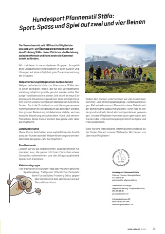 meine-region.ch meine-region.ch Vereine 631 Hundesport Pfannenstil St%u00e4fa: Sport, Spass und Spiel auf zwei und vier BeinenDer Verein besteht seit 1985 und ist Mitglied der SKG und ZHV. Der %u00dcbungsplatz befi ndet sich auf dem Frohberg St%u00e4fa. Unser Ziel ist es, die Beziehung zwischen Mensch und Hund sowie die Kameradschaft zu f%u00f6rdern.Wir trainieren in verschiedenen Gruppen. Ausgebildete Gruppenleiter:innen achten in allen Kursen und %u00dcbungen auf eine m%u00f6glichst gute Zusammensetzung der Gruppen. Welpenf%u00f6rderung (Obligatorium Kanton Z%u00fcrich)Welpen befi nden sich bis zum Alter von ca. 16%u00a0Wochen in einer sensiblen Phase, die f%u00fcr die Verhaltensentwicklung m%u00f6glichst positiv genutzt werden sollte. Der junge Hund kann sich in dieser Zeit leicht an neue Eindr%u00fccke und Situationen gew%u00f6hnen. Dies erm%u00f6glicht es ihm, sich in unserer komplexen Welt besser zurecht zu fi nden. Auch die Sozialisation und die angemessene Kommunikation mit Artgenossen soll gef%u00f6rdert werden. Von grosser Bedeutung ist dabei eine stabile, vertrauensvolle Beziehung zwischen dem Hund und seinem Menschen. Diese Kurse werden das ganze Jahr %u00fcber durchgef%u00fchrt.Junghunde KurseDiese Kurse beinhalten eine weiterf%u00fchrende Ausbildung der Hunde nach der Welpenf%u00f6rderung und werden ebenfalls das ganze Jahr durchgef%u00fchrt.Familienhunde%u2026 bilden wir zu gut sozialisierten, ausgeglichenen Kameraden aus, die gerne mit ihren Menschen etwas Sinnvolles unternehmen und die Alltagstauglichkeit spielerisch trainieren. KleinhundegruppeHier trainieren wir auf dem Platz oder machen gef%u00fchrte Spazierg%u00e4nge. Treffpunkt: %u00f6ffentlicher Parkplatz beim Fussballplatz Frohberg St%u00e4fa, gegen%u00fcber der Halle f%u00fcr Alle. Wir freuen uns auf Sie und Ihren Hund.Hundesport Pfannenstil St%u00e4faPatricia%u0009Fischer,%u0009%u00dcbungsleiterin077 431 14 92patricia@hs-pfannenstil.chAlessandra PiccalugaWelpenf%u00f6rderung,%u0009Junghunde%u0009Kurse%u0009051 281 63 82picca@bluewin.chSchwerzestrasse 238618 Oetwil am Seewww.hs-pfannenstil.chNeben den Kursen unternehmen wir viel zusammen:Sommer- und Winterspazierg%u00e4nge, Herbstwanderungen, Refresherkurse und Plauschturniere. Dabei steht der gemeinsame Spass mit unseren Tieren klar im Vordergrund und kein Hund wird zu irgendetwas gezwungen. Unsere Mitglieder kommen auch gern nach den Kursen oder Unternehmungen gem%u00fctlich zu Speis und Trank zusammen. Viele weitere interessante Informationen und tolle Bilder fi nden Sie auf unserer Webseite. Wir freuen uns %u00fcber neue Mitglieder!