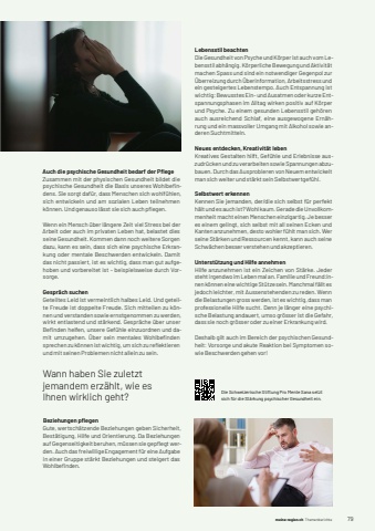 meine-region.ch meine-region.ch Themenberichte 796Auch die psychische Gesundheit bedarf der Pfl egeZusammen mit der physischen Gesundheit bildet die psychische Gesundheit die Basis unseres Wohlbefi ndens. Sie sorgt daf%u00fcr, dass Menschen sich wohlf%u00fchlen, sich entwickeln und am sozialen Leben teilnehmen k%u00f6nnen. Und genauso l%u00e4sst sie sich auch pfl egen. Wenn ein Mensch %u00fcber l%u00e4ngere Zeit viel Stress bei der Arbeit oder auch im privaten Leben hat, belastet dies seine Gesundheit. Kommen dann noch weitere Sorgen dazu, kann es sein, dass sich eine psychische Erkrankung oder mentale Beschwerden entwickeln. Damit das nicht passiert, ist es wichtig, dass man gut aufgehoben und vorbereitet ist %u2013 beispielsweise durch Vorsorge. Gespr%u00e4ch suchenGeteiltes Leid ist vermeintlich halbes Leid. Und geteilte Freude ist doppelte Freude. Sich mitteilen zu k%u00f6nnen und verstanden sowie ernstgenommen zu werden, wirkt entlastend und st%u00e4rkend. Gespr%u00e4che %u00fcber unser Befi nden helfen, unsere Gef%u00fchle einzuordnen und damit umzugehen. %u00dcber sein mentales Wohlbefi nden sprechen zu k%u00f6nnen ist wichtig, um sich zu refl ektieren und mit seinen Problemen nicht allein zu sein.Lebensstil beachtenDie Gesundheit von Psyche und K%u00f6rper ist auch vom Lebensstil abh%u00e4ngig. K%u00f6rperliche Bewegung und Aktivit%u00e4t machen Spass und sind ein notwendiger Gegenpol zur %u00dcberreizung durch %u00dcberinformation, Arbeitsstress und ein gesteigertes Lebenstempo. Auch Entspannung ist wichtig: Bewusstes Ein- und Ausatmen oder kurze Entspannungsphasen im Alltag wirken positiv auf K%u00f6rper und Psyche. Zu einem gesunden Lebensstil geh%u00f6ren auch ausreichend Schlaf, eine ausgewogene Ern%u00e4hrung und ein massvoller Umgang mit Alkohol sowie anderen Suchtmitteln.Neues entdecken, Kreativit%u00e4t lebenKreatives Gestalten hilft, Gef%u00fchle und Erlebnisse auszudr%u00fccken und zu verarbeiten sowie Spannungen abzubauen. Durch das Ausprobieren von Neuem entwickelt man sich weiter und st%u00e4rkt sein Selbstwertgef%u00fchl.Selbstwert erkennenKennen Sie jemanden, der/die sich selbst f%u00fcr perfekt h%u00e4lt und es auch ist? Wohl kaum. Gerade die Unvollkommenheit macht einen Menschen einzigartig. Je besser es einem gelingt, sich selbst mit all seinen Ecken und Kanten anzunehmen, desto wohler f%u00fchlt man sich. Wer seine St%u00e4rken und Ressourcen kennt, kann auch seine Schw%u00e4chen besser verstehen und akzeptieren.Unterst%u00fctzung und Hilfe annehmenHilfe anzunehmen ist ein Zeichen von St%u00e4rke. Jeder steht irgendwo im Leben mal an. Familie und Freund:innen k%u00f6nnen eine wichtige St%u00fctze sein. Manchmal f%u00e4llt es jedoch leichter, mit Aussenstehenden zu reden. Wenn die Belastungen gross werden, ist es wichtig, dass man professionelle Hilfe sucht. Denn je l%u00e4nger eine psychische Belastung andauert, umso gr%u00f6sser ist die Gefahr, dass sie noch gr%u00f6sser oder zu einer Erkrankung wird.Deshalb gilt auch im Bereich der psychischen Gesundheit: Vorsorge und akute Reaktion bei Symptomen sowie Beschwerden gehen vor!Wann haben Sie zuletzt jemandem erz%u00e4hlt, wie es Ihnen wirklich geht? Die Schweizerische Stiftung Pro Mente Sana setzt sich%u0009f%u00fcr%u0009die%u0009St%u00e4rkung%u0009psychischer%u0009Gesundheit%u0009ein.Beziehungen pfl egenGute, wertsch%u00e4tzende Beziehungen geben Sicherheit, Best%u00e4tigung, Hilfe und Orientierung. Da Beziehungen auf Gegenseitigkeit beruhen, m%u00fcssen sie gepfl egt werden. Auch das freiwillige Engagement f%u00fcr eine Aufgabe in einer Gruppe st%u00e4rkt Beziehungen und steigert das Wohlbefi nden.