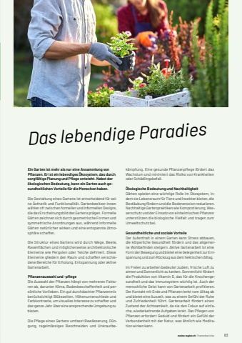 meine-region.ch meine-region.ch Themenberichte 831Das lebendige ParadiesEin Garten ist mehr als nur eine Ansammlung von Pfl anzen. Er ist ein lebendiges %u00d6kosystem, das durch sorgf%u00e4ltige Planung und Pfl ege entsteht. Nebst der %u00f6kologischen Bedeutung, kann ein Garten auch gesundheitlichen Vorteile f%u00fcr die Menschen haben.Die Gestaltung eines Gartens ist entscheidend f%u00fcr seine %u00c4sthetik und Funktionalit%u00e4t. Gartenbesitzer:innen w%u00e4hlen oft zwischen formellen und informellen Designs, die das Erscheinungsbild des Gartens pr%u00e4gen. Formelle G%u00e4rten zeichnen sich durch geometrische Formen und symmetrische Anordnungen aus, w%u00e4hrend informelle G%u00e4rten nat%u00fcrlicher wirken und eine entspannte Atmosph%u00e4re schaffen.Die Struktur eines Gartens wird durch Wege, Beete, Rasenfl %u00e4chen und m%u00f6glicherweise architektonische Elemente wie Pergolen oder Teiche defi niert. Diese Elemente gliedern den Raum und schaffen verschiedene Bereiche f%u00fcr Erholung, Entspannung oder aktive Gartenarbeit.Pfl anzenauswahl und -pfl egeDie Auswahl der Pfl anzen h%u00e4ngt von mehreren Faktoren ab, darunter Klima, Bodenbeschaffenheit und pers%u00f6nliche Vorlieben. Ein gut durchdachter Pfl anzenmix ber%u00fccksichtigt Bl%u00fctezeiten, H%u00f6henunterschiede und Farbkontraste, um visuelles Interesse zu schaffen und das ganze Jahr %u00fcber eine ansprechende Umgebung zu bieten.Die Pfl ege eines Gartens umfasst Bew%u00e4sserung, D%u00fcngung, regelm%u00e4ssiges Beschneiden und Unkrautbek%u00e4mpfung. Eine gesunde Pfl anzenpfl ege f%u00f6rdert das Wachstum und minimiert das Risiko von Krankheiten oder Sch%u00e4dlingsbefall.%u00d6kologische Bedeutung und NachhaltigkeitG%u00e4rten spielen eine wichtige Rolle im %u00d6kosystem, indem sie Lebensraum f%u00fcr Tiere und Insekten bieten, die Best%u00e4ubung f%u00f6rdern und die Bodenerosion reduzieren. Nachhaltige Gartenpraktiken wie Kompostierung, Wasserschutz und der Einsatz von einheimischen Pfl anzen unterst%u00fctzen die biologische Vielfalt und tragen zum Umweltschutz bei.Gesundheitliche und soziale VorteileDer Aufenthalt in einem Garten kann Stress abbauen, die k%u00f6rperliche Gesundheit f%u00f6rdern und das allgemeine Wohlbefi nden steigern. Aktive Gartenarbeit ist eine Form der Bewegung und bietet eine Gelegenheit zur Entspannung und zum R%u00fcckzug aus dem hektischen Alltag.Im Freien zu arbeiten bedeutet zudem, frische Luft zu atmen und Sonnenlicht zu tanken. Sonnenlicht f%u00f6rdert die Produktion von Vitamin D, das f%u00fcr die Knochengesundheit und das Immunsystem wichtig ist. Auch der menschliche Geist kann von Gartenarbeit profi tieren. Der Kontakt mit Erde und Pfl anzen lenkt vom Alltag ab und bietet eine Auszeit, was zu einem Gef%u00fchl der Ruhe und Zufriedenheit f%u00fchrt. Gartenarbeit f%u00f6rdert einen Zustand der Achtsamkeit, da sie den Fokus auf einfache, wiederkehrende Aufgaben lenkt. Das Pfl egen von Pfl anzen erfordert Geduld und f%u00f6rdert ein Gef%u00fchl der Verbundenheit mit der Natur, was %u00e4hnlich wie Meditation wirken kann.