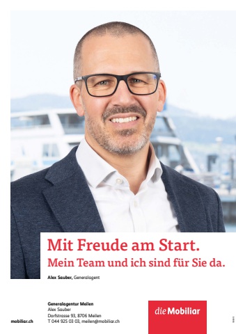 86 meine-region.ch Inhaltmobiliar.chGeneralagentur MeilenAlex SauberDorfstrasse 93, 8706 MeilenT 044 925 03 03, meilen@mobiliar.ch 1908913 Mit Freude am Start. Mein Team und ich sind f%u00fcr Sie da.Alex Sauber, Generalagent