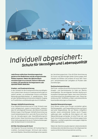 meine-region.ch meine-region.ch Themenberichte 871Individuell abgesichert: Schutz f%u00fcr Verm%u00f6gen und Lebensqualit%u00e4tJede Person sollte ihren Versicherungsschutz gezielt an ihre Bed%u00fcrfnisse und die entsprechenden Risiken anpassen. Neben den %u00fcblichen Basisversicherungen ist es sinnvoll, Policen in Betracht zu ziehen, die spezifi sche Verm%u00f6genswerte oder spezielle Risiken abdecken. Kranken- und ZusatzversicherungIn der Schweiz ist die Krankenversicherung obligatorisch, jedoch kann sie durch Zusatzversicherungen erweitert werden, um erstklassigen Schutz und fl exible Behandlungsm%u00f6glichkeiten zu gew%u00e4hrleisten. Eine private Spitalzusatzversicherung erm%u00f6glicht Zugang zu Privatkliniken und Behandlungen durch Chef%u00e4rzte. Manager-Haftpfl ichtversicherungEine Haftpfl ichtversicherung ist in der Schweiz zwar nicht obligatorisch, jedoch unverzichtbar, insbesondere f%u00fcr verm%u00f6gende Personen, die h%u00f6here fi nanzielle Risiken tragen. Eine Manager-Haftpfl ichtversicherung macht beispielsweise Sinn, wenn die Person eine Position als Verwaltungsrat oder Gesch%u00e4ftsleitungsmitglied innehat. Diese Versicherung sch%u00fctzt gegen m%u00f6gliche Haftungsanspr%u00fcche durch Fehlentscheidungen oder Vers%u00e4umnisse im Unternehmen.All-Risk-Versicherung f%u00fcr KunstVerm%u00f6gende Personen besitzen oft hochwertige Immobilien, Kunstsammlungen, Schmuck oder andere wertvolle Objekte. Diese G%u00fcter ben%u00f6tigen einen speziellen Versicherungsschutz. Eine All-Risk-Versicherung f%u00fcr Kunst und Sammlungen bietet Schutz gegen eine Vielzahl von Risiken und umfasst oft auch den Transport, beispielsweise bei Leihgaben an Museen oder Ausstellungen.RechtsschutzversicherungDie Privat- und Berufsrechtsschutzversicherung deckt Anwalts- und Gerichtskosten im Falle von Rechtsstreitigkeiten. Da verm%u00f6gende Familien h%u00e4ufi g auch komplexe Erbregelungen haben, kann eine Erbrechtsschutzversicherung empfehlenswert sein. Diese Versicherung hilft, Konfl ikte zu l%u00f6sen und erbrechtliche Auseinandersetzungen zu fi nanzieren.Spezielle ReiseversicherungenAuch Reisen sollten ohne Sorgen vonstatten gehen. Die Reisegep%u00e4ck- und Flugausfallversicherung sichert wertvolle Gegenst%u00e4nde, die auf Reisen mitgef%u00fchrt werden sowie entstehende Kosten durch Flugversp%u00e4tungen oder -ausf%u00e4lle ab. Sind eigene Luft- oder Wasserfahrzeuge vorhanden, ist eine Privat-Jet- und Yacht-Versicherung wichtig. Sie sch%u00fctzen gegen hohe Reparatur- und Wartungskosten sowie gegen m%u00f6gliche Haftungsanspr%u00fcche.Neben der Absicherung des eigenen Lebensstandards sind besonders die Absicherung von Verm%u00f6genswerten sowie rechtliche Schutzmassnahmen wichtig.