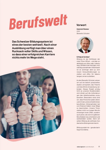 meine-region.ch meine-region.ch Aus der Berufswelt Einstiegsseiten 91VorwortHeinrich MeisterCEOBenedict SchulenErfolg ist lernbar!Bildung ist der Schl%u00fcssel, der viele T%u00fcren %u00f6ffnet %u2013 und das unabh%u00e4ngig von Alter oder Lebensweg. Gerade in der heutigen, sich st%u00e4ndig wandelnden Arbeitswelt ist es wichtiger denn je, sich neuen Herausforderungen zu stellen und offen f%u00fcr lebenslanges Lernen zu bleiben.An den Benedict Schulen setzen wir auf ein betont praxisnahes duales Lernsystem, das Theorie und berufl iche Anwendung verbindet. Dieses Modell erm%u00f6glicht es unseren Studierenden, sich direkt auf die Anforderungen des Arbeitsmarktes vorzubereiten. Besonders stolz sind wir, dass Menschen jeden Alters und mit den unterschiedlichsten berufl ichen Hintergr%u00fcnden bei uns Chancen haben, neue Wege zu beschreiten. Unsere T%u00fcren stehen nicht nur jungen Berufseinsteiger:innen offen, sondern auch jenen, die sich im sp%u00e4teren Berufsleben neu orientieren und weiterbilden wollen. Denn wir sehen Bildung als zeitloses Gut, das keine Altersgrenzen kennt.Bildung endet nie %u2013 gerade darin liegt ihre St%u00e4rke.BerufsweltDas Schweizer Bildungssystem ist eines der besten weltweit. Nach einer Ausbildung verf%u00fcgt man %u00fcber einen Rucksack voller Skills und Wissen, so dass einer erfolg reichen Karriere nichts mehr im Wege steht.
