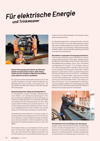941 meine-region.ch Top LehrbetriebF%u00fcr elektrische Energie und TrinkwasserDie drei Versorgungsunternehmen am Z%u00fcrichsee beliefern die Gemeinden Uerikon, St%u00e4fa, Meilen, Uetikon am See, Erlenbach, K%u00fcsnacht und Zollikon unter anderem mit Strom und Wasser. Als regional verankerte Betriebe investieren wir in die Jugend und bilden Lernende in diversen Berufen aus.Netzelektriker/innen werden immer gebraucht %u2013 f%u00fcr den Ausbau der Netze der Zukunft. Doch was machen die Profi s genau?Abwechslungsreicher Alltag als Netzelektriker/inIm Schwerpunkt Energie verlegen Netzelektriker/innen Nieder- und Hochspannungsleitungen im Boden. Sie bereiten Kabelenden f%u00fcr die Verbindung vor, montieren Abzweigmuffen und schliessen die Kabel an Netzelemente wie Hausanschl%u00fcsse an. Bei Freileitungen stellen sie Masten auf, an denen die Strom- und Kommunikationsleitungen befestigt werden. Ein weiterer Aufgabenbereich ist das Errichten und Instandhalten von Transformatorenstationen und Verteilern. Netzelektriker/innen k%u00fcmmern sich auch um den Unterhalt der %u00f6ffentlichen Beleuchtung. Sie kontrollieren die Lichtk%u00f6rper, ersetzen defekte Lampen und ziehen wenn n%u00f6tig neue Kabel ein. Manchmal geh%u00f6rt auch das Anbringen der Weihnachtsbeleuchtung zu ihren Aufgaben.Die Eins%u00e4tze fi nden an verschiedensten Orten und oft auch im Freien statt. Dabei arbeiten sie vor allem im Team. Auch die Sicherheit ist dabei ein zentrales Thema: Sie sch%u00fctzen sich vor den Gefahren des Stroms und m%u00fcssen sich als Teammitglieder voll und ganz aufeinander verlassen k%u00f6nnen.Ein abwechslungsreicher, herausfordernder Job also, der sich f%u00fcr Sch%u00fcler:innen aller Bildungs stufen eignet. Nach dem Ausbildungsabschluss stehen Dir die T%u00fcren f%u00fcr eine Vielzahl von attraktiven Weiterbildungsm%u00f6glichkeiten offen, wie etwa die Berufspr%u00fcfung zum Netzfachmann mit Fachausweis. Berufslehre in regionalen VersorgungsunternehmenErlernen kannst Du diesen spannenden Beruf in mehreren Betrieben der Region. Einer dieser drei Betriebe ist die Werke am Z%u00fcrichsee AG. Die Firma ist in den sechs Gesch%u00e4ftsbereichen Wasser, Strom, Gas, Fernw%u00e4rme und Digitalnetz f%u00fcr Internet, TV und Telefon sowie einem Elektrofachgesch%u00e4ft in K%u00fcsnacht t%u00e4tig und stellt so eine optimale Versorgung der Gemeinden Zollikon, K%u00fcsnacht und Erlenbach sicher. Auch die Infrastruktur Z%u00fcrichsee AG kennt sich aus mit Strom- und Wasserversorgung, mit Bauvorhaben, alternativen Energien und Verrechnungsl%u00f6sungen. Zust%u00e4ndig ist die Unternehmung f%u00fcr die Gemeinden Meilen und Uetikon am See und sorgt dort mit Zuverl%u00e4ssigkeit f%u00fcr effi ziente und einwandfreie Abl%u00e4ufe. Die Gemeindewerke St%u00e4fa widmen sich der Versorgung der Gemeinde St%u00e4fa mit elektrischer Energie sowie mit Trinkwasser.Foto:%u0009Adobe%u0009Stock%u0009/%u0009KadmyNetzelektriker/innen als R%u00fcckgrat der VersorgungGerade in Zeiten der Klimakrise und der Energieknappheit ist der Beruf Netzelektriker/in von zentraler Bedeutung. Die Herausforderungen der Energieversorgung und -verteilung wachsen und das Energiesystem ist zunehmend mit Ver%u00e4nderungen konfrontiert. Als