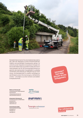 meine-region.ch Top Lehrbetrieb 95meine-region.ch Top Lehrbetriebe 2Interessiert? Dann melde Dich jetzt f%u00fcr eine Schnupperlehre.Gemeindewerke St%u00e4faSeestrasse 89, 8712 St%u00e4fa043 928 10 10info@gws.chwww.gws.chInfrastruktur Z%u00fcrichsee AGSchulhausstrasse 18, 8706 Meilen044 924 18 18info@infra-z.chwww.infra-z.chWerke am Z%u00fcrichsee AGFreihofstrasse%u000930,%u00098700%u0009K%u00fcsnacht043 222 32 32info@werkezuerichsee.chwww.werkezuerichsee.chNetzelektriker/in kannst Du entscheidend dazu beitragen, dass der %u00dcbergang zu einem klimafreundlichen, stabilen und nachhaltigen Energiesystem gelingt. So wirkst Du an der Integration erneuerbarer Energien mit, bist an der Modernisierung und dem Ausbau der Stromnetze beteiligt, bist f%u00fcr die Versorgungssicherheit angesichts des wachsenden Energiebedarfs zust%u00e4ndig und leistest einen Beitrag zur Reduzierung von Emissionen. Als Netzelektriker/in schaffst und pfl egst du das R%u00fcckgrat unserer Stromversorgung - die Netzinfrastruktur - und tr%u00e4gst so zu einer sicheren und stabilen Energiezukunft bei.