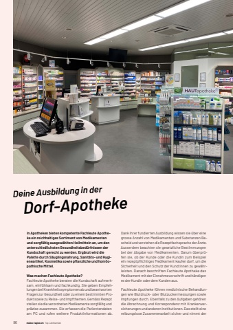 961 meine-region.ch Top LehrbetriebDeine Ausbildung in der Dorf-ApothekeIn Apotheken bieten kompetente Fachleute Apotheke ein reichhaltiges Sortiment von Medikamenten und sorgf%u00e4ltig ausgew%u00e4hlten Heil mitteln an, um den unterschiedlichsten Gesundheitsbed%u00fcrfnissen der Kundschaft gerecht zu werden. Erg%u00e4nzt wird die Palette durch S%u00e4uglingsnahrung, Sanit%u00e4ts- und Hygieneartikel, Kosmetika sowie pfl anzliche und hom%u00f6opathische Mittel.Was machen Fachleute Apotheke?Fachleute Apotheke beraten die Kundschaft aufmerksam, einf%u00fchlsam und fachkundig. Sie geben Empfehlungen bei Krankheitssymptomen ab und beantworten Fragen zur Gesundheit oder zu einem bestimmten Produkt sowie zu Reise- und Impfthemen. Gem%u00e4ss Rezept stellen sie die verordneten Medikamente sorgf%u00e4litg und pr%u00e4zise zusammen. Sie erfassen die Patientendaten am PC und rufen weitere Produktinformationen ab. Dank ihrer fundierten Ausbildung wissen sie %u00fcber eine grosse Anzahl von Medikamenten und Substanzen Bescheid und verstehen die Rezeptfachsprache der %u00c4rzte. Ausserdem beachten sie gesetzliche Bestimmungen bei der Abgabe von Medikamenten. Darum %u00fcberpr%u00fcfen sie, ob der Kunde oder die Kundin zum Beispiel ein rezeptpfl ichtiges Medikament kaufen darf, um die Sicherheit und den Schutz der Kund:innen zu gew%u00e4hrleisten. Danach beschriften Fachleute Apotheke das Medikament mit der Einnahmevorschrift und h%u00e4ndigen es der Kundin oder dem Kunden aus.Fachleute Apotheke f%u00fchren medizinische Behandlungen wie Blutdruck- oder Blutzuckermessungen sowie Impfungen durch. Ebenfalls zu den Aufgaben geh%u00f6ren die Abrechnung und Korrespondenz mit Krankenversicherungen und anderen Institutionen. Das stellt eine reibungslose Zusammenarbeit sicher und nimmt der