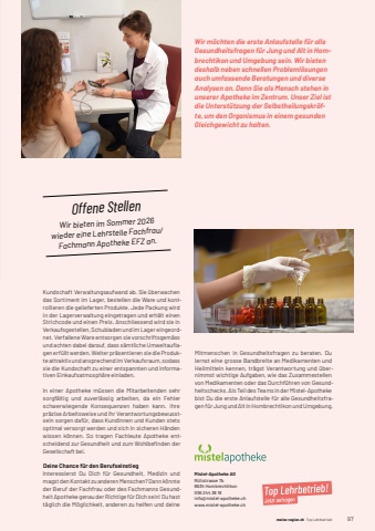 meine-region.ch Top Lehrbetrieb 97meine-region.ch Top Lehrbetriebe 2Wir m%u00f6chten die erste Anlaufstelle f%u00fcr alle Gesundheitsfragen f%u00fcr Jung und Alt in Hombrechtikon und Umgebung sein. Wir bieten deshalb neben schnellen Probleml%u00f6sungen auch umfassende Beratungen und diverse Analysen an. Denn Sie als Mensch stehen in unserer Apotheke im Zentrum. Unser Ziel ist die Unterst%u00fctzung der Selbstheilungskr%u00e4fte, um den Organismus in einem gesunden Gleichgewicht zu halten.Kundschaft Verwaltungsaufwand ab. Sie %u00fcberwachen das Sortiment im Lager, bestellen die Ware und kontrollieren die gelieferten Produkte. Jede Packung wird in der Lagerverwaltung eingetragen und erh%u00e4lt einen Strichcode und einen Preis. Anschliessend wird sie in Verkaufsgestellen, Schubladen und im Lager eingeordnet. Verfallene Ware entsorgen sie vorschriftsgem%u00e4ss und achten dabei darauf, dass s%u00e4mtliche Umweltaufl agen erf%u00fcllt werden. Weiter pr%u00e4sentieren sie die Produkte attraktiv und ansprechend im Verkaufsraum, sodass sie die Kundschaft zu einer entspannten und informativen Einkaufsatmosph%u00e4re einladen.In einer Apotheke m%u00fcssen die Mitarbeitenden sehr sorgf%u00e4ltig und zuverl%u00e4ssig arbeiten, da ein Fehler schwerwiegende Konsequenzen haben kann. Ihre pr%u00e4zise Arbeitsweise und ihr Verantwortungsbewusstsein sorgen daf%u00fcr, dass Kundinnen und Kunden stets optimal versorgt werden und sich in sicheren H%u00e4nden wissen k%u00f6nnen. So tragen Fachleute Apotheke entscheidend zur Gesundheit und zum Wohlbefi nden der Gesellschaft bei.Deine Chance f%u00fcr den BerufseinstiegInteressierst Du Dich f%u00fcr Gesundheit, Medizin und magst den Kontakt zu anderen Menschen? Dann k%u00f6nnte der Beruf der Fachfrau oder des Fachmanns Gesundheit Apotheke genau der Richtige f%u00fcr Dich sein! Du hast t%u00e4glich die M%u00f6glichkeit, anderen zu helfen und deine Mistel-Apotheke AGR%u00fctistrasse 7b8634 Hombrechtikon 055 244 38 18info@mistel-apotheke.ch www.mistel-apotheke.chOffene StellenWir bieten im Sommer 2026 wieder eine Lehrstelle Fachfrau/ Fachmann Apotheke EFZ an. Mitmenschen in Gesundheitsfragen zu beraten. Du lernst eine grosse Bandbreite an Medikamenten und Heilmitteln kennen, tr%u00e4gst Verantwortung und %u00fcbernimmst wichtige Aufgaben, wie das Zusammestellen von Medikamenten oder das Durchf%u00fchren von Gesundheitschecks. Als Teil des Teams in der Mistel-Apotheke bist Du die erste Anlaufstelle f%u00fcr alle Gesundheitsfragen f%u00fcr Jung und Alt in Hombrechtikon und Umgebung.
