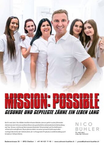 102 meine-region.ch Themenberichte Bei Dr. med. dent. Nico B%u00fchler sind Sie in besten H%u00e4nden, denn er geh%u00f6rt zu den f%u00fchrenden Zahn%u00e4rzten der Schweiz und bietet Ihnen eine ganzheitliche zahnmedizinische Behandlung auf Top-Niveau, welche auf dem neuesten Stand der Wissenschaft und Technik basiert %u2013 schmerzfrei und e%u0080 izient. Sie profi tieren dabei von seiner grossen Erfahrung in allen wichtigen Bereichen der Zahnmedizin, der vorbeugenden Prophylaxe und Behandlung auch komplexer Zahnprobleme. Dr. med. dent.eidg. dipl. ZahnarztBadenerstrasse 20 | 8953 Dietikon | +41 44 431 11 40 | www.zahnarzt-buehler.ch | praxis@zahnarzt-buehler.ch