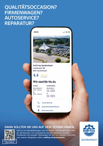 104 meine-region.ch InhaltGeht es um Dienstleistungen rund um Traum- und Firmenwagen, sind wir die Nummer 1 im Limmattal bei Service, Reparatur, Qualit%u00e4tsOccasionen und Auswahl. %u00dcberzeugen Sie sich von unserem Know-how und unseren F%u00e4higkeiten selbst. emilfrey.ch/spreitenbachQUALIT%u00c4TSOCCASION? FIRMENWAGEN?AUTOSERVICE? REPARATUR?DANN SOLLTEN SIE UNS AUF DEM SCHIRM HABEN. Gleich scannen und mehr erfahren