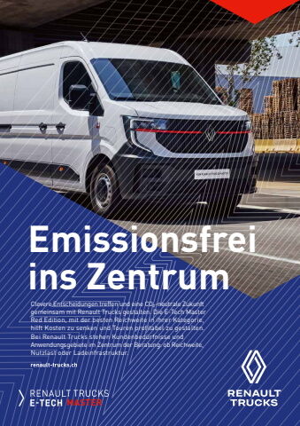 106 meine-region.ch Themenberichte MASTER Emissionsfreiins ZentrumClevere Entscheidungen treffen und eine CO%u2082-neutrale Zukunft gemeinsam mit Renault Trucks gestalten. Die E-Tech Master Red Edition, mit der besten Reichweite in ihrer Kategorie, hilft Kosten zu senken und Touren profitabel zu gestalten. Bei Renault Trucks stehen Kundenbed%u00fcrfnisse und Anwendungsgebiete im Zentrum der Beratung: ob Reichweite, Nutzlast oder Ladeinfrastruktur.