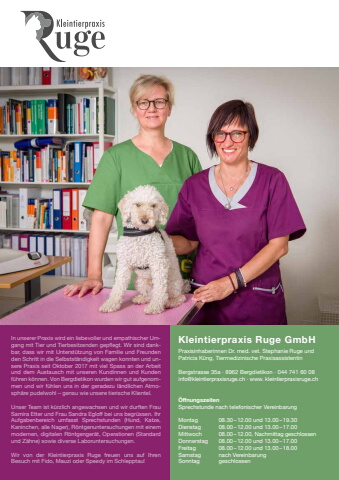 110 meine-region.ch Themenberichte Kleintierpraxis Ruge GmbHPraxisinhaberinnen Dr. med. vet. Stephanie Ruge und Patricia K%u00fcng, Tiermedizinische PraxisassistentinBergstrasse 35a %u00b7 8962 Bergdietikon %u00b7 044 741 60 08info@kleintierpraxisruge.ch %u00b7 www. kleintierpraxisruge.ch%u00d6ff nungszeitenSprechstunde nach telefonischer VereinbarungMontag 08.30 %u2013 12.00 und 13.00 %u2013 19.30Dienstag 08.00 %u2013 12.00 und 13.00 %u2013 17.00Mittwoch 08.00 %u2013 12.00, Nachmittag geschlossenDonnerstag 08.00 %u2013 12.00 und 13.00 %u2013 17.00Freitag 08.00 %u2013 12.00 und 13.00 %u2013 18.00Samstag nach Vereinbarung Sonntag geschlossenIn unserer Praxis wird ein liebevoller und empathischer Umgang mit Tier und Tierbesitzenden gepfl egt. Wir sind dankbar, dass wir mit Unterst%u00fctzung von Familie und Freunden den Schritt in die Selbstst%u00e4ndigkeit wagen konnten und unsere Praxis seit Oktober 2017 mit viel Spass an der Arbeit und dem Austausch mit unseren Kundinnen und Kunden f%u00fchren k%u00f6nnen. Von Bergdietikon wurden wir gut aufgenommen und wir f%u00fchlen uns in der geradezu l%u00e4ndlichen Atmosph%u00e4re pudelwohl %u2013 genau wie unsere tierische Klientel.Unser Team ist k%u00fcrzlich angewachsen und wir durften Frau Samira Etter und Frau Sandra Egloff bei uns begr%u00fcssen. Ihr Aufgabenbereich umfasst Sprechstunden (Hund, Katze, Kaninchen, alle Nager), R%u00f6ntgenuntersuchungen mit einem modernen, digitalen R%u00f6ntgenger%u00e4t, Operationen (Standard und Z%u00e4hne) sowie diverse Laboruntersuchungen.Wir von der Kleintierpraxis Ruge freuen uns auf Ihren Besuch mit Fido, Mauzi oder Speedy im Schlepptau!