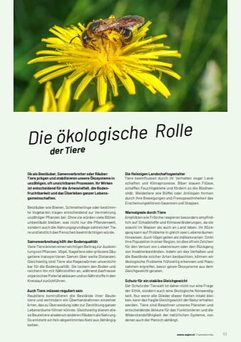 meine-region.ch meine-region.ch Themenberichte 111Die %u00f6kologische Rolle der Tiere Ob als Best%u00e4uber, Samenverbreiter oder R%u00e4uber:Tiere pr%u00e4gen und stabilisieren unsere %u00d6kosysteme in unz%u00e4hligen, oft unsichtbaren Prozessen. Ihr Wirken ist entscheidend f%u00fcr die Artenvielfalt, die Bodenfruchtbarkeit und das %u00dcberleben ganzer Lebensgemeinschaften.Best%u00e4uber wie Bienen, Schmetterlinge oder bestimmte Vogelarten tragen entscheidend zur Vermehrung unz%u00e4hliger Pfl anzen bei. Ohne sie w%u00fcrden viele Bl%u00fcten unbest%u00e4ubt bleiben, was nicht nur die Pfl anzenwelt, sondern auch die Nahrungsgrundlage zahlreicher Tiere und letztlich des Menschen beeintr%u00e4chtigen w%u00fcrde.Samenverbreitung hilft der Bodenqualit%u00e4tViele Tiere leisten einen wichtigen Beitrag zur Ausbreitung von Pfl anzen. V%u00f6gel, Nagetiere oder gr%u00f6ssere S%u00e4ugetiere transportieren Samen %u00fcber weite Distanzen. Gleichzeitig sind Tiere wie Regenw%u00fcrmer unverzichtbar f%u00fcr die Bodenqualit%u00e4t. Sie lockern den Boden und reichern ihn mit N%u00e4hrstoffen an, w%u00e4hrend Aasfresser organisches Material abbauen und so N%u00e4hrstoffe in den Kreislauf zur%u00fcckf%u00fchren.Auch Tiere m%u00fcssen reguliert sein Raubtiere kontrollieren die Best%u00e4nde ihrer Beutetiere und verhindern ein %u00dcberhandnehmen einzelner Arten, das zu %u00dcberweidung oder zur Zerst%u00f6rung ganzer Lebens r%u00e4ume f%u00fchren k%u00f6nnte. Gleichzeitig dienen diese Beutetiere wiederum anderen R%u00e4ubern als Nahrung. So entsteht ein fein abgestimmtes Netz aus Abh%u00e4ngigkeiten. Die fl eissigen Landschaftsgestalter Tiere beeinfl ussen durch ihr Verhalten sogar Landschaften und Klimaprozesse. Biber stauen Fl%u00fcsse, schaffen Feuchtgebiete und f%u00f6rdern so die Biodiversit%u00e4t. Weidetiere wie B%u00fcffel oder Antilopen formen durch ihre Bewegungen und Fressgewohnheiten das Erscheinungsbild von Savannen und Steppen.Warnsignale durch TiereAmphibien wie Fr%u00f6sche reagieren besonders empfi ndlich auf Schadstoffe und Klimaver%u00e4nderungen, da sie sowohl im Wasser als auch an Land leben. Ihr R%u00fcckgang kann auf Probleme in gleich zwei Lebensr%u00e4umen hinweisen. Auch V%u00f6gel gelten als Indikatorarten: Sinkt ihre Population in einer Region, ist dies oft ein Zeichen f%u00fcr den Verlust von Lebensraum oder den R%u00fcckgang von Insektenbest%u00e4nden. Indem wir das Verhalten und die Best%u00e4nde solcher Arten beobachten, k%u00f6nnen wir %u00f6kologische Probleme fr%u00fchzeitig erkennen und Massnahmen ergreifen, bevor ganze %u00d6kosysteme aus dem Gleich gewicht geraten.Schutz f%u00fcr ein stabiles GleichgewichtDer Schutz der Tierwelt ist daher nicht nur eine Frage der Ethik, sondern auch eine %u00f6kologische Notwendigkeit. Nur wenn alle Glieder dieser Ketten intakt bleiben, kann das fragile Gleichgewicht der Natur erhalten werden. Tiere sind Bewohner unseres Planeten und entscheidende Akteure f%u00fcr das Funktionieren und die Widerstandsf%u00e4higkeit der nat%u00fcrlichen Systeme, von denen auch der Mensch abh%u00e4ngt.