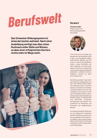 meine-region.ch meine-region.ch Aus der Berufswelt Einstiegsseiten 1131BerufsweltDas Schweizer Bildungssystem ist eines der besten weltweit. Nach einer Ausbildung verf%u00fcgt man %u00fcber einen Rucksack voller Skills und Wissen, so dass einer erfolg reichen Karriere nichts mehr im Wege steht.VorwortChristian Sch%u00e4li Regierungsrat undStiftungsratspr%u00e4sident SwissSkillsUnd schon sind sie wieder Vergangenheit: die SwissSkills 2025 in Bern. Die SwissSkills haben eindrucksvoll gezeigt, wie viel Kraft in unserer Berufsbildung steckt. Junge Fachkr%u00e4fte aus allen Regionen und Branchen haben mit K%u00f6nnen, Leidenschaft und Innovationsgeist ihre Be rufe pr%u00e4sentiert %u2013 und damit nicht nur Medaillen, sondern vor allem Herzen gewonnen.Die Wirkung solcher Tage reicht weit %u00fcber den Wettbewerb hinaus. Die Teilnehmenden gewinnen Selbstvertrauen und Sichtbarkeit, sie werden zu Vorbildern und Botschafterinnen einer Berufsbildung, die Chancen er%u00f6ffnet und Exzellenz f%u00f6rdert. Gleichzeitig senden die Swiss Skills ein starkes Signal an Gesellschaft und Wirtschaft: Praxisnahe Kompetenzen sind ebenso entscheidend f%u00fcr Wohlstand und Innovation wie akademisches Wissen.So sind die SwissSkills 2025 nicht nur ein H%u00f6hepunkt im Kalender der Berufsbildung, sondern auch ein Impulsgeber f%u00fcr die Zukunft %u2013 ein Beweis, dass unsere jungen Talente die Schweiz mit Energie, Kreativit%u00e4t und Durchhaltewillen nachhaltig pr%u00e4gen.