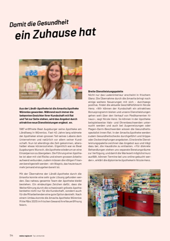 114 meine-region.ch Top LehrbetriebDamit die Gesundheit ein Zuhause hatAus der L%u00e4ndli-Apotheke ist die Amavita Apotheke W%u00fcrenlos geworden. W%u00e4hrend noch immer die bekannten Gesichter ihrer Kundschaft mit Rat und Tat zur Seite stehen, wird das Angebot durch attraktive neue Dienstleistungen erg%u00e4nzt. en.1987 er%u00f6ffnete Beat Augsburger seine Apotheke am L%u00e4ndliweg in W%u00fcrenlos. Fast 40 Jahre lang widmete der Apotheker einen grossen Teil seines Lebens dem Unternehmen und nat%u00fcrlich vor allem seiner Kundschaft. Nun ist allerdings die Zeit gekommen, altershalber etwas k%u00fcrzerzutreten. Eigentlich war es Beat Augsburgers Wunsch, die Apotheke wiederum an eine Einzelperson zu %u00fcbergeben. Die F%u00fchrung einer Apotheke ist aber mit viel Risiko und einem grossen Arbeitsaufwand verbunden, zudem m%u00fcssen die n%u00f6tigen Finanzen bereitgestellt werden %u2013 ein Wagnis, das heute kaum mehr jemand einzugehen bereit ist. Mit der %u00dcbernahme der L%u00e4ndli-Apotheke durch die Amavita konnte eine sehr gute L%u00f6sung gefunden werden. Das nahezu gesamte Team der Apotheke bleibt bestehen. Ein eindeutiges Zeichen daf%u00fcr, dass die Weiterf%u00fchrung durch die schweizweit gr%u00f6sste Apothekenkette nicht nur f%u00fcr die Kundschaft, sondern auch f%u00fcr die Mitarbeitenden eine gute Option darstellt. Nach einem Umbau konnte die Amavita Apotheke W%u00fcrenlos Mitte M%u00e4rz 2025 im frischen Gewand ihre Neuer%u00f6ffnung feiern. Breite DienstleistungspaletteNicht nur das Ladeninterieur erscheint in frischem Glanz. Die %u00dcbernahme durch die Amavita bringt noch einige weitere Neuerungen mit sich %u2013 durchwegs positive, fi ndet die aktuelle Gesch%u00e4ftsf%u00fchrerin Nicole Henz. %u00abWir k%u00f6nnen der Kundschaft ein attraktives Bonusprogramm bieten und unsere Dienstleistungen gehen weit %u00fcber den Verkauf von Medikamenten hinaus%u00bb, sagt Nicole Henz. So k%u00f6nnen in der Apotheke beispielsweise Hals- und Ohrenbeschwerden untersucht werden und auch bei Augenreizungen oder Magen-Darm-Beschwerden wissen die Gesundheitsspezialist:innen Rat. In der Amavita Apotheke werden zudem Gesundheitschecks durchgef%u00fchrt und Grippeoder Zeckenimpfungen angeboten. Eine breite Dienstleistungspalette zeichnet das Angebot aus und tr%u00e4gt dazu bei, die Haus%u00e4rzte zu entlasten. %u00abF%u00fcr diskrete Behandlungen stehen uns separate Beratungsr%u00e4ume zur Verf%u00fcgung, und damit die Wartezeit m%u00f6glichst kurz ausf%u00e4llt, k%u00f6nnen Termine bei uns online gebucht werden%u00bb, erkl%u00e4rt die diplomierte Apothekerin Nicole Henz. Nicole%u0009Henz,%u0009Gesch%u00e4ftsf%u00fchrerin