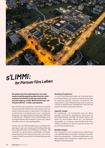 116 meine-region.ch meine-region.ch Top Lehrbetrieb Top Lehrbetriebes'LIMMI: Ihr Partner f%u00fcrs LebenAls bedeutender Gesundheitspartner mit umfassendem Ausbildungsauftrag %u00fcbernimmt der Spitalverband Limmattal die erweiterte medizinische Grundversorgung von %u00fcber 98 000 Patientinnen und Patienten j%u00e4hrlich %u2013 in allen Lebensphasen.Das LIMMI ist breit spezialisiert und bietet eine qualitativ hochstehende medizinische Versorgung sowie vertieftes Expertenwissen in zahlreichen chirurgischen, medizinischen und pfl egerischen Fach- und Spezialdisziplinen. Der Spitalverband verf%u00fcgt %u00fcber 188 Betten im Akutbereich, 126 Betten in der Langzeitpfl ege, einen spitalgebundenen Rettungsdienst sowie neun Operationss%u00e4le und acht Intensivpfl egepl%u00e4tze.Unsere mehr als 1700 Mitarbeitenden aus 56 Nationen erbringen in den verschiedensten Fachdisziplinen t%u00e4glich ausgezeichnete und vielf%u00e4ltige Leistungen. Wir verstehen uns als attraktiver Arbeitgeber und bieten vielseitige berufl iche Herausforderungen, ein motivierendes Umfeld sowie zahlreiche Weiterbildungsm%u00f6glichkeiten.Berufl iche PerspektivenIn rund 20 Fachbereichen bieten wir vielseitige berufliche M%u00f6glichkeiten und moderne Arbeitsbedingungen f%u00fcr Menschen jeglicher Herkunft und Sprachen. Wir unterst%u00fctzen unsere Mitarbeitenden beim Erwerb berufl icher und pers%u00f6nlicher Kompetenzen, damit sie sich weiterentwickeln und entfalten k%u00f6nnen.Heute f%u00fcr morgenAls Ausbildungs- und Lehrbetrieb sorgt der Spitalverband Limmattal f%u00fcr qualifi zierten Nachwuchs im Gesundheitswesen, auch %u00fcber die Region hinaus. Wir bieten f%u00fcr ver schiedene Berufe Aus- und Weiterbildungspl%u00e4tze an. Lernende sowie Studierende unterst%u00fctzen und f%u00f6rdern wir beim Erwerb berufl icher und pers%u00f6nlicher Kompetenzen. Attraktive RegionDas Limmattal ist eine ausgesprochen dynamische und vielf%u00e4ltige Wachstumsregion. Sie bietet mit vielen Naherholungs gebieten, Einkaufsm%u00f6glichkeiten und Sport anlagen einen attraktiven Lebensraum mit vielf%u00e4ltigen Freizeitangeboten.