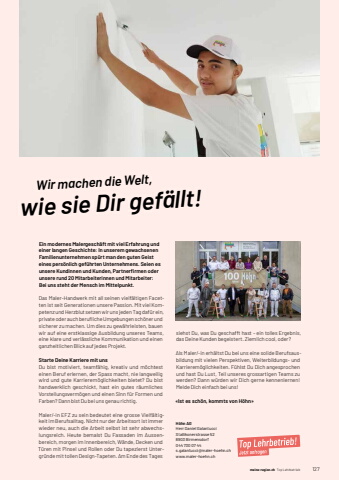 meine-region.ch meine-region.chTop Lehrbetriebe Top Lehrbetrieb 1271H%u00f6hn AGHerr%u0009Daniel%u0009GalantucciStallikonerstrasse%u0009528903%u0009Birmensdorf%u0009044%u0009730%u000907%u000944s.galantucci@maler-hoehn.chwww.maler-hoehn.ch Wir machen die Welt,wie sie Dir gef%u00e4llt!Ein modernes Malergesch%u00e4ft mit viel Erfahrung und einer langen Geschichte: In unserem gewachsenen Familienunternehmen sp%u00fcrt man den guten Geist eines pers%u00f6nlich gef%u00fchrten Unternehmens. Seien es unsere Kundinnen und Kunden, Partnerfi rmen oder unsere rund 20 Mitarbeiterinnen und Mitarbeiter:Bei uns steht der Mensch im Mittelpunkt.Das Maler-Handwerk mit all seinen vielf%u00e4ltigen Facetten ist seit Generationen unsere Passion. Mit viel Kompetenz und Herzblut setzen wir uns jeden Tag daf%u00fcr ein, private oder auch berufl iche Umgebungen sch%u00f6ner und sicherer zu machen. Um dies zu gew%u00e4hrleisten, bauen wir auf eine erstklassige Ausbildung unseres Teams, eine klare und verl%u00e4ssliche Kommunikation und einen ganzheitlichen Blick auf jedes Projekt.Starte Deine Karriere mit unsDu bist motiviert, teamf%u00e4hig, kreativ und m%u00f6chtest einen Beruf erlernen, der Spass macht, nie langweilig wird und gute Karrierem%u00f6glichkeiten bietet? Du bist handwerklich geschickt, hast ein gutes r%u00e4umliches Vorstellungsverm%u00f6gen und einen Sinn f%u00fcr Formen und Farben? Dann bist Du bei uns genau richtig.Maler/-in EFZ zu sein bedeutet eine grosse Vielf%u00e4ltigkeit im Berufsalltag. Nicht nur der Arbeitsort ist immer wieder neu, auch die Arbeit selbst ist sehr abwechslungsreich. Heute bemalst Du Fassaden im Aussenbereich, morgen im Innenbereich, W%u00e4nde, Decken und T%u00fcren mit Pinsel und Rollen oder Du tapezierst Untergr%u00fcnde mit tollen Design-Tapeten. Am Ende des Tages siehst Du, was Du geschafft hast %u2013 ein tolles Ergebnis, das Deine Kunden begeistert. Ziemlich cool, oder?Als Maler/-in erh%u00e4ltst Du bei uns eine solide Berufsausbildung mit vielen Perspektiven, Weiterbildungs- und Karrierem%u00f6glichkeiten. F%u00fchlst Du Dich angesprochen und hast Du Lust, Teil unseres grossartigen Teams zu werden? Dann w%u00fcrden wir Dich gerne kennenlernen! Melde Dich einfach bei uns!%u00abIst es sch%u00f6n, kommts von H%u00f6hn%u00bb