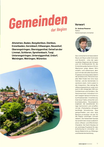meine-region.ch meine-region.ch Aus den Gemeinden Gemeinden 11GemeindenAltstetten, Baden, Bergdietikon, Dietikon, Ennetbaden, Geroldswil, Killwangen, Neuenhof, Oberengstringen, Obersiggenthal, Oetwil an der Limmat, Schlieren, Spreitenbach, Turgi, Unterengstringen, Untersiggenthal, Urdorf, Weiningen, Wettingen, W%u00fcrenlosder RegionVorwortDr. Andreas MessmerRektor Kantonsschule LimmattalDas Limmattal ist ein besonderer Raum, ein Raum voller Kontraste und Dynamik %u2013 eine der spannendsten Regionen der Schweiz und mit Schl%u00fcsselrolle f%u00fcr die Entwicklung des Kantons Z%u00fcrich. Wachstum pr%u00e4gt diesen Wirtschafts- und Lebensraum, dem auch mit den aktuellen baulichen Projekten eine besondere Identit%u00e4t verliehen wird. Menschen aus aller Welt fi nden hier eine neue Heimat, und die Gemeinden investieren stark, nicht zuletzt in die Integration. Das stetige Bev%u00f6lkerungswachstum zeigt sich auch in der steigenden Zahl von Sch%u00fclerinnen und Sch%u00fclern. Die Kantonsschule Limmattal in Urdorf reagiert darauf mit einer zukunftsweisenden Erweiterung:Zwei neue Trakte, entworfen vom Architekturb%u00fcro Penzisbettini, erg%u00e4nzen die bestehende Anlage harmonisch und schaffen mit der %u00abPerlenkette%u00bb dringend ben%u00f6tigte Schulzimmer, Doppelsporthallen und eine Aula. Bestens erreichbar mit der f%u00fcr die Region wichtigen Limmattalbahn. Die Haltestelle Kantiallee verleiht dem Areal zus%u00e4tzlich einen offenen und %u00f6ffentlichen Charakter. Der Kanti-Neubau ist ein wichtiges Puzzleteil f%u00fcr den Aufschwung im Limmattal %u2013 ein klares Bekenntnis zur Bildungsund Standortentwicklung.