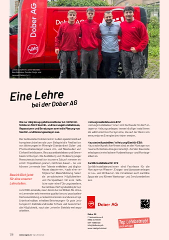 128 meine-region.ch Top Lehrbetrieb meine-region.ch Top Lehrbetriebe 1Dober AGFriedaustrasse%u000968952%u0009Schlieren044%u0009733%u000960%u000900info@doberag.chwww.haelg.ch/doberEine Lehre bei der Dober AGDie zur H%u00e4lg Group geh%u00f6rende Dober AG mit Sitz in Schlieren f%u00fchrt Sanit%u00e4r- und Heizungsinstallationen, Reparaturen und Beratungen sowie die Planung von Sanit%u00e4r- und Heizungsanlagen aus.Der Geb%u00e4udetechnikbetrieb ist zudem spezialisiert auf komplexe Arbeiten wie zum Beispiel die Realisation von Wohnungen im Minergie-Standard mit Solar- und Photovoltaikanlagen sowie Um- und Neubauten von Einfamilienh%u00e4usern, Restaurantbetrieben und Gewerbeeinrichtungen. Die Ausbildung und F%u00f6rderung junger Menschen als Investition in unsere Zukunft nehmen wir ernst: Projektieren, planen, zeichnen, bauen %u2013 bei uns k%u00f6nnen Lernende ihre Talente entfalten und t%u00e4glich Neues dazulernen. Nach einer erfolgreichen Berufsbildung haben sie verschiedene M%u00f6glichkeiten und Perspektiven f%u00fcr eine fachliche oder eine F%u00fchrungskarriere. Zurzeit besch%u00e4ftigt die H%u00e4lg Group rund 100 Lernende, neun davon bei der Dober AG. Unsere Lernenden erfahren eine qualitative und praxisorientierte Ausbildung, erleben interessante und vielseitige Arbeitseins%u00e4tze, erhalten Belohnungen f%u00fcr gute Leistungen im Betrieb und in der Schule und bekommen die M%u00f6glichkeit, nach der Lehre im Betrieb weiterzuarbeiten.Janik Schaffner, Armir Ahmeti, Berufsbildner%u0009Zvonko%u0009Grujic%u0009und%u0009Leonard%u0009Selimi%u0009(v.%u0009l.)Heizungsinstallateur/in EFZHeizungsinstallateur/innen sind Fachleute f%u00fcr die Montage von Heizungsanlagen. Immer h%u00e4ufi ger installieren sie w%u00e4rmetechnische Systeme, die auf der Basis von erneuerbaren Energien betrieben werden. Haustechnikpraktiker/in Heizung/Sanit%u00e4r EBA:Haustechnikpraktiker/innen sind an der Montage von haustechnischen Anlagen beteiligt. Auf der Baustelle erledigen sie einfachere Vorbereitungs- und Montagearbeiten. Sanit%u00e4rinstallateur/in EFZSanit%u00e4rinstallateure/innen sind Fachleute f%u00fcr die Montage von Wasser-, Erdgas- und Abwasseranlagen in Neu- und Umbauten. Sie installieren auch sanit%u00e4re Apparate und f%u00fchren Wartungs- und Servicearbeiten aus.Bewirb Dich jetzt f%u00fcr eine unserer Lehrstellen.
