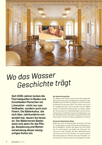 12 meine-region.ch meine-region.ch GemeindenWo das Wasser Geschichte tr%u00e4gtSeit 2000 Jahren locken die Thermalquellen in Baden und Ennetbaden Menschen ins Limmattal %u2013 nicht nur zum Heilbaden, sondern auch zum Feiern. Die B%u00e4derkultur, die sich %u00fcber Jahrhunderte entwickelt hat, dauert bis heute an. Der B%u00e4derverein Baden setzt sich aktiv f%u00fcr die Pfl ege, Bewahrung und Weiterentwicklung dieser einzigartigen Kultur ein.Der Verein f%u00fcr das ErbeDer B%u00e4derverein Baden wurde Ende 2017 gegr%u00fcndet. Denn die Erinnerung an die B%u00e4derkultur Baden ist in der Bev%u00f6lkerung nicht mehr so pr%u00e4sent, wie es ihre einstige Bedeutung vermuten l%u00e4sst. Der Verein hat es sich zur Aufgabe gemacht, das kulturelle Erbe der B%u00e4der wieder ins %u00f6ffentliche Bewusstsein zu r%u00fccken. Neben der Vernetzung von Projektbeteiligten und historisch Interessierten schafft der Verein auch Plattformen, um der Bev%u00f6lkerung die kulturelle und geschichtliche Bedeutung der Thermen von Baden zug%u00e4nglich zu machen.Ein kurzer historischer AbrissBaden war einst ein bedeutender r%u00f6mischer Thermalort: Im Mittelalter und der Fr%u00fchen Neuzeit z%u00e4hlte es zu den Modeb%u00e4dern n%u00f6rdlich der Alpen und noch Mitte des 19. Jahrhunderts war Baden der f%u00fchrende Tourismusort in der Schweiz. Die %u00fcber 2000-j%u00e4hrige Geschichte reicht von den R%u00f6mern, die einen grossen Thermenkomplex errichteten %u00fcber das Mittelalter, wo die Strukturen weiter genutzt und ausgebaut wurden Foto:%u0009B%u00e4derverein%u0009Baden