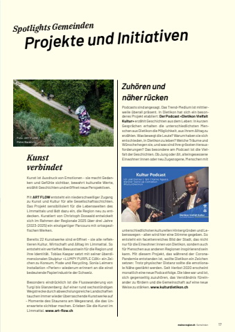 meine-region.ch meine-region.ch Gemeinden 171Spotlights Gemeinden Projekte und InitiativenKunst verbindetKunst ist Ausdruck von Emotionen %u2013 sie macht Gedanken und Gef%u00fchle sichtbar, bewahrt kulturelle Werte, erz%u00e4hlt Geschichten und er%u00f6ffnet neue Perspektiven.Mit ART FLOW entsteht ein niederschwelliger Zugang zu Kunst und Kultur f%u00fcr alle Gesellschaftsschichten. Das Projekt sensibilisiert f%u00fcr die Lebenswelten des Limmattals und l%u00e4dt dazu ein, die Region neu zu entdecken. Kuratiert von Christoph Doswald entwickelt sich im Rahmen der Regionale 2025 %u00fcber drei Jahre (2023%u20132025) ein einzigartiger Parcours mit ortsspezifi schen Werken.Bereits 22 Kunstwerke sind er%u00f6ffnet %u2013 sie alle refl ektieren Kultur, Wirtschaft und Alltag im Limmattal. So entsteht ein vertieftes Bewusstsein f%u00fcr die Region und ihre Identit%u00e4t. Tobias Kaspar setzt mit seiner %u00fcberdimensionalen Skulptur %u00abLUMPY PURPLE CAN%u00bb ein Zeichen zu Konsum, Mode und Recycling. Sonia Leimers Installation %u00abPerlen%u00bb wiederum erinnert an die einst bedeutende Papierindustrie der Schweiz.Besonders eindr%u00fccklich ist die Flusswanderung von Turgi bis Glanzenberg: Auf einer rund sechsst%u00fcndigen Wegstrecke durch abwechslungsreiche Landschaften tauchen immer wieder %u00fcberraschende Kunstwerke auf %u2013 Momente des Staunens am Wegesrand, die das Unerwartete sichtbar machen. Erleben Sie die Kunst im Limmattal. www.art-fl ow.ch Zuh%u00f6ren und n%u00e4her r%u00fcckenPodcasts sind angesagt. Das Trend-Medium ist mittlerweile %u00fcberall pr%u00e4sent. In Dietikon hat sich ein besonderes Projekt etabliert:Der Podcast %u00abDietikon Vielfalt Kultur%u00bb erz%u00e4hlt Geschichten aus dem Leben: In kurzen Gespr%u00e4chen erhalten die unterschiedlichsten Menschen aus Dietikon die M%u00f6glichkeit, aus ihrem Alltag zu erz%u00e4hlen. Was bewegt die Leute? Warum haben sie sich entschieden, in Dietikon zu leben? Welche Tr%u00e4ume und W%u00fcnsche hegen sie, und was sind ihre gr%u00f6ssten Herausforderungen? Das besondere am Podcast ist die Vielfalt der Geschichten. Ob Jung oder Alt, alteingesessene Einwohner:innen oder neu Zugezogene, Menschen mit unterschiedlichsten kulturellen Hintergr%u00fcnden und Lebenswegen %u2013 allen wird hier eine Stimme gegeben. So entsteht ein facettenreiches Bild der Stadt, das nicht nur f%u00fcr die Einwohner:innen von Dietikon, sondern auch f%u00fcr Menschen aus anderen Regionen inspirierend sein kann. Mit diesem Projekt, das w%u00e4hrend der CoronaPandemie entstanden ist, wollte Dietikon ein Zeichen setzen: Trotz physischer Distanz sollte die emotionale N%u00e4he gest%u00e4rkt werden. Seit Herbst 2020 erscheint monatlich eine neue Podcastfolge. Die Idee war und ist, sich gegenseitig zuzuh%u00f6ren, das Verst%u00e4ndnis f%u00fcreinander zu f%u00f6rdern und die Gemeinschaft auf eine neue Weise zu st%u00e4rken. www.kulturdietikon.chFoto: ART FLOW / Peter%u0009Baracchi
