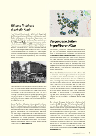 meine-region.ch meine-region.ch Gemeinden 213Mit dem Drahteseldurch die StadtMehr Velos als Einwohnende %u2013 daf%u00fcr ist die Hauptstadt der Niederlande bekannt. Vielleicht reiht sich aber auch Baden bald zwischen Amsterdam, Kopenhagen und Utrecht in die Liste der ber%u00fchmten Fahrradst%u00e4dte ein.Das Velokonzept Baden steht zumindest schon und bereits in den Jahren 2023 und 2024 hat die Stadt diverse Massnahmen umgesetzt, um Baden velofreundlicher zu machen. Zahlreich ist die Liste der Strassen, in denen das Velonetz aufgewertet wurde, viele neue Veloabstellpl%u00e4tze kamen hinzu und auch f%u00fcr die F%u00f6rderung der Velokultur wird fortlaufend einiges getan. Das Projekt wurde 2022 vom Stadtrat genehmigt, die Umsetzung erfolgt in Etappen.Vergangene Zeitenin greifbarer N%u00e4heHistorische Quellen sind oftmals in Archiven verborgen und dazu verdammt, ewige Staubf%u00e4nger zu sein. Nicht so in Bergdietikon: Geschichte wird dort durch die interaktive online-Geschichtskarte zug%u00e4nglich und anschaulich. Das Projekt des Ortsmuseums Bergdietikon st%u00e4rkt die lokale Identit%u00e4t, f%u00f6rdert den Austausch zwischen Generationen und dient Schulen, Forschung und Tourismus als anschauliches Werkzeug. Die Multimedialen Inhalte lassen die Geschichte lebendig und geifbar werden %u2013 und helfen uns, vergangene Zeiten besser zu verstehen.Mit der Geschichtskarte kann man sich auf eine Reise einlassen: von der Vergangenheit in die Gegenwart und wieder zur%u00fcck. Alle sehenswerten und geschichtstr%u00e4chtigen Orte der Gemeinde sind auf der Karte erfasst, hinterlegt mit spannenden Fotos, Informationen und Geschichten. Der Aufbau der Webseite erlaubt gezielte Filter- und Suchfunktionen; wer m%u00f6chte, kann sich aber auch intuitiv durch die Karte klicken und schauen, wo die Reise hinf%u00fchrt. Zudem k%u00f6nnen Fragen an eine KI gestellt werden, die diese in der Rolle eines Historikers in verst%u00e4ndlicher Sprache beantwortet. Und wer beim Spaziergang durchs Dorf etwas lernen m%u00f6chte, kann unkompliziert per App auf die Karte zugreifen.Der fr%u00fcheste Beleg auf der Karte ist in Baltenschwil verortet: Am 22. November 1122 schenkte Konrad Freiherr von Sellenb%u00fcren (Stallikon) seinen Besitz in Baltenschwil dem von ihm gegr%u00fcndeten Kloster Engelberg. Heute weist eine Ortstafel mit der Geschichte des Weilers Baltenschwil auf diese Ereignisse hin. Die zu erkundenen Belege reichen von Familiengeschichten %u00fcber Aufnahmen von Schulklassen bis hin zu Geb%u00e4udeaufnahmen und vielem mehr. Eine Erkundungstour auf der online-Karte versetzt einem in eine fr%u00fchere Welt. Inspiriert von Bergdietikon haben sich auch drei weitere Gemeinden f%u00fcr eine Geschichtskarte entschieden. Sie sind derzeit dabei, ihre Informationen in die dynamischen online-Karten einzupfl egen. www.ortsmuseumbergdietikon.chMassnahmen m%u00fcssen vorg%u00e4ngig sorgf%u00e4ltig geplant werden: Sie haben einen langen Berarbeitungszeitraum, m%u00fcssen Machbarkeitsstudien und Projektausarbeitung durchlaufen, bis es zur Umsetzung kommt. Zur Schonung der fi nanziellen Ressourcen werden die Massnahmen oft mit anderen Projekten koordiniert %u2013 auch Baustellenl%u00e4rm, Verschmutzung und Umleitungen bleiben so m%u00f6glichst gering.Auf der Plattform %u00abbikeable%u00bb k%u00f6nnen Velofahrer:innen direktes Feedback geben: Wo gibt es Schwachstellen? Wo gute Beispiele f%u00fcr Velofreundlichkeit? Die Beitr%u00e4ge werden monatlich von der Badener Stadtentwicklung gepr%u00fcft, kommentiert und wenn notwendig mit weiteren Abteilungen besprochen. Ob die Massnahmen wirken, wird durch Erhebungen zum Verkehrsverhalten der Badnerinnen und Badner gemessen. Zudem kommen automatisierte Veloverkehrsz%u00e4hlstellen zum Einsatz, die eine Aussage %u00fcber die Nutzung der Veloinfrastruktur erm%u00f6glichen. www.baden.chFoto:%u0009Historisches%u0009Museum%u0009Baden,%u0009Fotosammlung