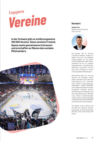 meine-region.ch meine-region.ch Vereine 251VereineEngagierteIn der Schweiz gibt es sch%u00e4tzungsweise 100 000 Vereine. Diese vereinen Freizeit, Spass sowie gemeinsame Interessen und erschaffen so R%u00e4ume des sozialen Miteinanders. VorwortSandro FreiHead of CommunicationZSC Lions AGAls jemand, der im Z%u00fcrcher Limmattal arbeitet, erlebe ich t%u00e4glich, wie bunt und vielf%u00e4ltig unsere Region ist. Von Sportund Musikvereinen %u00fcber Kulturinitiativen bis hin zu sozialen Organisationen %u2013 sie alle bringen Menschen zusammen und machen das Limmattal zu einem Ort des gelebten Miteinanders. Gleichzeitig sehe ich, wie eng Vereine und Gewerbe miteinander verbunden sind. Dank der Unterst%u00fctzung von Unternehmen k%u00f6nnen Veranstaltungen stattfi nden, Talente gef%u00f6rdert und Traditionen bewahrt werden. Umgekehrt schenken Vereine den Betrieben Sichtbarkeit und eine enge Bindung zur Bev%u00f6lkerung. Dieses Zusammenspiel macht unser Limmattal lebendig %u2013 und zeigt: Gemeinsam gestalten wir die Zukunft unserer Region.Viel Spass an der Lekt%u00fcre und bis bald am n%u00e4chsten Vereinsanlass oder an einem Heimspiel der ZSC Lions in der Swiss Life Arena!