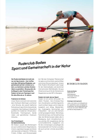 meine-region.ch meine-region.ch Vereine 31Olivia%u0009Nacht%u0009Foto:%u0009J%u00e9r%u00f4me%u0009Laurent Ruderclub BadenSport und Gemeinschaft in der NaturDer Ruderclub Baden ist mehr als nur ein Sportverein %u2013 hier treffen sich %u00fcber 200 aktive Mitglieder, um gemeinsam auf der Limmat zu rudern, zu trainieren und das Vereinsleben zu gestalten. Ob jung oder alt, Anf%u00e4ngerin oder Freizeitsportler:Rudern ist bei uns Teamsport und f%u00fcr alle offen ab ca. 12 Jahren.Trainieren im Gr%u00fcnen Unser Revier erstreckt sich zwischen dem Kraftwerk Wettingen und Oetwil %u2013 eine Strecke, die sowohl idyllische Ruhe als auch sportliche Herausforderung bietet. Das Clubhaus in Neuenhof punktet mit moderner Infrastruktur:Bootshalle, Trainingsraum, Garderoben und gem%u00fctlicher Clubraum inklusive.Von Freizeitsport bis Spitzenleistung Wir f%u00f6rdern sowohl den Breitensport als auch ambitionierte Regattateams. Unsere Jugendsportgruppe war dieses Jahr besonders erfolgreich: 110 Rennen, 11 Gold-, 5 Silber- und 3 Bronzemedaillen! Bei den Schweizer Meisterschaften gab es nochmal Gold, zweimal Silber und einmal Bronze obendrauf. Unsere Elite-Ruderin Olivia Nacht rudert sogar f%u00fcr den Nationalkader und startet bei internationalen Wettk%u00e4mpfen. Sie qualifi zierte sich auch f%u00fcr die Teilnahme im Doppelvierer an der WM in Shanghai.Rudern ist mehr als nur SportRudern ist ein echter Allrounder: Es st%u00e4rkt Muskeln, Herz-Kreislauf-System, Koordination und Gleichgewicht, macht einfach Spass und ist ideal als Ausgleich zum Alltag. Wanderfahrten, Clubregatta, Sommerfest und Chlaush%u00f6ck %u2013 bei uns wird Gemeinschaft grossgeschrieben. Workshops, Techniktrainings und Rumpftraining %u00fcber die Wintermonate halten alle in Bewegung. Auch Umweltschutz ist uns wichtig: Wir respektieren die Naturschutzbereiche, engagieren uns f%u00fcr die Limmatregion und pfl egen die Kameradschaft mit Fischern und allen, die auch auf der Limmat anzutreffen sind.Ruderclub BadenSeestrasse%u0009195432%u0009Neuenhof%u0009lehrgang@rcbaden.chwww.rcbaden.chEinsteigen leicht gemacht Jedes%u0009Jahr%u0009bieten%u0009wir%u0009Anf%u00e4ngerkurse%u0009f%u00fcr%u0009Jugendliche%u0009sowie%u0009Lehrg%u00e4nge%u0009f%u00fcr%u0009Erwachsene.%u0009Die%u0009Anmeldung%u0009l%u00e4uft%u0009per%u0009Formular%u0009auf%u0009unserer%u0009Webseite%u0009oder%u0009per Mail an info@rcbaden.ch.O NL I NEB U AE F TRAG E NGutes f%u00fcr IhreTextilienPROFESSIONELLETEXTILREINIGUNG BEIMMUTSCH CENTER INBERIKON AG. Von der Kuscheldeckebis zur dreckigenSocke. Bei uns ist IhreW%u00e4sche in denbesten H%u00e4nden.ProfessionellFamili%u00e4rKostenloser Lieferservice W%u00f6schify+ 20 Jahre ErfahrungMutsch CenterBellikerstrasse 138965 Berikon info@woschify.ch056 631 34 00