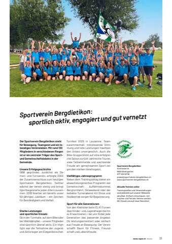 meine-region.ch meine-region.ch Vereine 331Sportverein Bergdietikon: sportlich aktiv, engagiert und gut vernetztDer Sportverein Bergdietikon steht f%u00fcr Bewegung, Teamgeist und ein lebendiges Vereinsleben. Mit rund 130 Mitgliedern in verschiedenen Riegen ist er ein zentraler Tr%u00e4ger des Sportund Gemeinschaftslebens in der Gemeinde.Unsere Erfolgsgeschichte1968 gegr%u00fcndet, zun%u00e4chst als Damen- und Turnverein, erfolgte 2002 der Zusammenschluss zum heutigen Sportverein Bergdietikon. Seither w%u00e4chst der Verein stetig und bringt Sportbegeisterte jeden Alters zusammen. 2018 feierten wir bereits unser 50-j%u00e4hriges Jubil%u00e4um %u2013 ein Zeichen f%u00fcr Best%u00e4ndigkeit und Vielfalt. Starke Leistungen und sportlicher EinsatzOb in der Turnhalle, auf dem Bike oder bei Wettk%u00e4mpfen %u2013 unsere Mitglieder sind sportlich %u00fcberall aktiv. Ein Highlight war die Teilnahme der Jugendund Aktivriegen am Eidgen%u00f6ssischen Turnfest 2025 in Lausanne. Teamzusammenhalt, mitreissende Stimmung und tolle Leistungen machten den Anlass unvergesslich. Auch die Bike-Gruppe blickt auf eine erfolgreiche Saison zur%u00fcck: zahlreiche Touren, viele Teilnehmende und wachsende Freude am gemeinsamen Sport zeigen den starken Vereinsgeist.Vielf%u00e4ltiges JahresprogrammNeben dem Trainingsalltag bietet ein abwechslungsreiches Programm viel Gemeinschaft: Auffahrtsbummel, Bergturnfahrt, Skiweekend oder der beliebte Turnerabend mit Show und Festbetrieb sorgen f%u00fcr Begeisterung.Sport f%u00fcr alle GenerationenVon den Kleinsten beim ELKI-Turnen %u00fcber Kinder- und Jugendriegen bis hin zu Erwachsenen %u2013 bei uns fi ndet jede Generation das passende Angebot. Ob leistungsorientiert oder einfach aus Freude an Bewegung: Der Verein schafft Raum f%u00fcr Fitness, Freundschaft und Lebensfreude.Sportverein BergdietikonAustrasse%u00091a5620%u0009Bremgarten077%u0009453%u000953%u000955%u0009praesi@sportverein-bergdietikon.chwww.sportverein-bergdietikon.chAktuelle Termine onlineTrainingszeiten%u0009und%u0009Veranstaltungen%u0009sind%u0009jederzeit%u0009auf%u0009unserer%u0009Webseite%u0009abrufbar.%u0009Einfach%u0009reinschauen,%u0009mitmachen%u0009und%u0009Teil%u0009des%u0009Vereins%u0009werden.%u0009Wir%u0009freuen%u0009uns%u0009auf%u0009neue%u0009Gesichter!