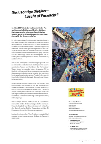 meine-region.ch meine-region.ch Vereine 371Die luschtige Dietiker - Luscht uf Fasnacht?Im Jahre 2007 feierte der traditionelle Kinder-Fasnachtsumzug in Dietikon sein 30 Jahre Jubil%u00e4um. Statt dass man dies mit grossen Feierlichkeiten kundtat, wurde im OK beschlossen, eine neue Gruppierung f%u00fcr den Umzug zu schaffen.Es sollte aber etwas Freudiges sein, das den Kindern und erwachsenen Zuschauenden Freude und Begeisterung bereitet. So liess man zum 30 Jahre Jubil%u00e4um 15 Masken und Kost%u00fcme herstellen. Eine lose Gruppierung entstand. Als es in der ganzen Organisation des Umzuges & Hudi-Balles um eine Neuorganisation dieser traditionellen Fasnachtsveranstaltung ging, hat man sich mit den Guggi-H%u00e4xen zusammengetan, um zuk%u00fcnftig die Gesamtorganisation dieser Veranstaltung zu %u00fcbernehmen.2014 wurde ein eigener Fasnachtswagen gebaut. Und so entstanden zus%u00e4tzlich noch die W%u00e4geler mit anders gestalteten Masken und Kost%u00fcmen. Das Merkmal der Wagen-Leute ist, dass bei jedem Umzug ca. 150 kg Konfetti mit ihren drei Kanonen verschossen werden. Die sogenannte Bodentruppe bereitet den meist vielen Umzugsbesuchenden grosse Freude, indem sie mit ihrer Fr%u00f6hlichkeit ein Schoggi- Stengeli und S%u00fcssigkeiten verteilen.Unsere Kinder sind die Fasn%u00e4chtler von morgen, deshalb wurden 2018 wiederum f%u00fcr die Kindergruppe Masken von einem Maskenbauer in Basel angefertigt und auch zus%u00e4tzliche Gew%u00e4ndli angeschafft. Die bunte Truppe nimmt j%u00e4hrlich an ca. f%u00fcnf Umz%u00fcgen in der Umgebung teil und organisiert zwei %u00f6ffentliche Anl%u00e4sse (11.November, Fasnachtser%u00f6ffnung, Kindergartenumzug mit Hudiparty).Die luschtige Dietiker sind zur Zeit 15 Erwachsene und rund 12 Kinder. An den Umz%u00fcgen d%u00fcrfen aber auch Freunde, Gsp%u00e4ndli und Bekannte jederzeit mitlaufen, dies l%u00e4sst die lustige Dietiker Truppe dann auf %u00fcber 35 Personen w%u00e4hrend den Umz%u00fcgen anwachsen.Lust auch mitzumachen? Kein Problem, melde dich bei uns oder besuche einen unserer Anl%u00e4sse der Fasnacht 2025/2026.Die luschtige DietikerSchachenmattstrasse 148953%u0009Dietikon076 424 70 40beni.huber@fein.chwww.dieluschtigedietiker.chVeranstaltungenAktuelle%u0009Termine%u0009entnehmen%u0009Sie%u0009bitte%u0009unserer%u0009Webseite.%u2022 11. November 2025 Fasnachtser%u00f6ffnung%u0009in%u0009der%u0009Markthalle Dietikon%u2022 31. Januar 2026 Kinderfasnacht%u0009Umzug%u0009und%u0009Hudiparty%u0009in%u0009der%u0009Stadthalle%u0009Dietikon