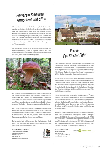 meine-region.ch Vereine 43meine-region.ch Vereine 4Dem Verein Pro Kloster Fahr geh%u00f6ren Menschen an, die das Kloster und die Benediktinerinnengemeinschaft sch%u00e4tzen und unterst%u00fctzen. Dies geschieht %u00fcber Veranstaltungen, Finanzierung von Projekten und tatkr%u00e4ftige Mitwirkung. Zudem tr%u00e4gt der Verein auf verschiedene Weise die Sanierung der Klostergeb%u00e4ude mit.Im Verein Pro Kloster Fahr sind %u00fcber 500 Menschen zusammengeschlossen. Ihnen steht die benediktinische Gemeinschaft ideell, kulturell und pers%u00f6nlich nahe. Mit den Vereinsbeitr%u00e4gen werden spezielle Projekte fi nanziell gef%u00f6rdert und durch die freiwilligen Eins%u00e4tze der Vereinsmitglieder die Benediktinerinnen vom Fahr tatkr%u00e4ftig unterst%u00fctzt.Die Aktivit%u00e4ten sind einerseits ein Fenster zur %u00d6ffentlichkeit und st%u00e4rken andererseits den Zusammenhalt innerhalb des Vereins Pro Kloster Fahr. Diejenigen Mitglieder, die Zeit und Freude haben, greifen den Schwestern tatkr%u00e4ftig unter die Arme und helfen mit, wenn es Arbeiten im Weinberg, im Garten oder im Kloster zu erledigen gibt.M%u00f6chten Sie Mitglied des Vereins Pro Kloster Fahr werden? Der Jahresbeitrag betr%u00e4gt CHF 50 f%u00fcr Einzelpersonen, CHF 80 f%u00fcr Ehepaare/Partnerschaften, CHF 100 f%u00fcr juristische Personen und Organisationen. G%u00f6nner sind Mitglieder, die mindestens CHF 500 beitragen. Auf der Webseite des Klosters Fahr fi nden Sie unter Kontakt ein Formular f%u00fcr Ihren Beitrittswunsch.Verein pro Kloster Fahr 8109%u0009Kloster%u0009Fahr043%u0009455%u000910%u000940vereinpro@kloster-fahr.chwww.kloster-fahr.chVereinPro Kloster FahrPilzverein Schlieren -kompetent und offenWir verstehen uns als ein Teil der mykologischen Gesamtorganisation der Schweiz und unterst%u00fctzen die Idee des Verbandes Schweizerischer Vereine f%u00fcr Pilzkunde. Wir pfl egen das gemeinsame Interesse und die Freude an der Mykologie (Pilzkunde) und setzen uns zum Ziel, das Fachwissen zu erlernen beziehungsweise zu erweitern. Wir sind offen %u2013 nach innen und aussen und erarbeiten eigene Mittel f%u00fcr die Finanzierung unserer VereinszweckeDer Pilzverein Schlieren ist ein attraktiver Anbieter f%u00fcr Naturliebhabende, denn er erg%u00e4nzt sinnvoll die Freizeitgestaltung und hat dabei einen sch%u00f6nen Lerneffekt auf neue, aber auch auf alte Mitglieder. Die Vorteile einer Mitgliedschaft in unserem Verein sind die F%u00f6rderung ganzheitlichen Denkens im Natur- und Pilzschutz, der Einsatz f%u00fcr fachgerechtes Sammeln von Pilzen und das Gestalten der Bestimmungsabende von Pilzen gem%u00e4ss den grunds%u00e4tzlichen Bed%u00fcrfnissen unserer Mitglieder %u2013 dies unter sachkundiger Leitung.Der Pilzverein Schlieren f%u00f6rdert die Zusammengeh%u00f6rigkeit sowie die Weiterbildung im Bereich der Pilzkunde. Wir organisieren w%u00e4hrend der Pilzsaison interessante Anl%u00e4sse rund um den Pilz, wie z.B. den Besuch von Fachtagungen, Exkursionen und Ausfl %u00fcge. Bei uns sind alle willkommen, die Pilzliebhaber sind, gern Pilze sammeln und bestimmen m%u00f6chten und die gern in der Natur unterwegs sind.Verein f%u00fcr Pilzkunde Schlieren J%u00fcrg%u0009Diggelmann,%u0009Pr%u00e4sidentHuebwiesenstrasse%u0009378954%u0009Geroldswil079%u0009404%u000904%u000925www.pilzverein-schlieren.chverein prokloster fahr
