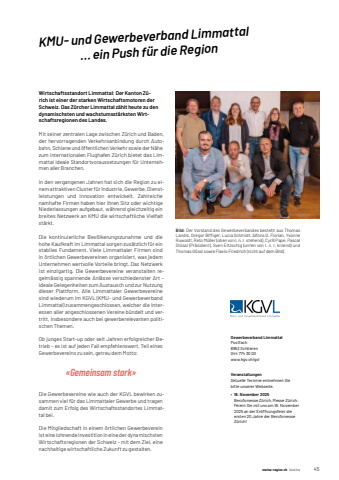 meine-region.ch meine-region.ch Vereine 451KMU- und Gewerbeverband Limmattal %u2026 ein Push f%u00fcr die RegionWirtschaftsstandort Limmattal: Der Kanton Z%u00fcrich ist einer der starken Wirtschaftsmotoren der Schweiz. Das Z%u00fcrcher Limmattal z%u00e4hlt heute zu den dynamischsten und wachstumsst%u00e4rksten Wirtschaftsregionen des Landes.Mit seiner zentralen Lage zwischen Z%u00fcrich und Baden, der hervorragenden Verkehrsanbindung durch Autobahn, Schiene und %u00f6ffentlichen Verkehr sowie der N%u00e4he zum internationalen Flughafen Z%u00fcrich bietet das Limmattal ideale Standortvoraussetzungen f%u00fcr Unternehmen aller Branchen.In den vergangenen Jahren hat sich die Region zu einem attraktiven Cluster f%u00fcr Industrie, Gewerbe, Dienstleistungen und Innovation entwickelt. Zahlreiche namhafte Firmen haben hier ihren Sitz oder wichtige Niederlassungen aufgebaut, w%u00e4hrend gleichzeitig ein breites Netzwerk an KMU die wirtschaftliche Vielfalt st%u00e4rkt.Die kontinuierliche Bev%u00f6lkerungszunahme und die hohe Kaufkraft im Limmattal sorgen zus%u00e4tzlich f%u00fcr ein stabiles Fundament. Viele Limmattaler Firmen sind in %u00f6rtlichen Gewerbevereinen organisiert, was jedem Unternehmen wertvolle Vorteile bringt. Das Netzwerk ist einzigartig. Die Gewerbevereine veranstalten regelm%u00e4ssig spannende Anl%u00e4sse verschiedenster Art %u2013 ideale Gelegenheiten zum Austausch und zur Nutzung dieser Plattform. Alle Limmattaler Gewerbevereine sind wiederum im KGVL (KMU- und Gewerbeverband Limmattal) zusammengeschlossen, welcher die Interessen aller angeschlossenen Vereine b%u00fcndelt und vertritt, insbesondere auch bei gewerberelevanten politischen Themen.Ob junges Start-up oder seit Jahren erfolgreicher Betrieb %u2013 es ist auf jeden Fall empfehlenswert, Teil eines Gewerbevereins zu sein, getreu dem Motto:Die Gewerbevereine wie auch der KGVL bewirken zusammen viel f%u00fcr das Limmattaler Gewerbe und tragen damit zum Erfolg des Wirtschaftsstandortes Limmattal bei.Die Mitgliedschaft in einem %u00f6rtlichen Gewerbeverein ist eine lohnende Investition in eine der dynamischsten Wirtschaftsregionen der Schweiz %u2013 mit dem Ziel, eine nachhaltige wirtschaftliche Zukunft zu gestalten.Gewerbeverband LimmattalPostfach8952%u0009Schlieren044%u0009774%u000930%u000900www.kgv.ch/gvlVeranstaltungenAktuelle%u0009Termine%u0009entnehmen%u0009Sie%u0009bitte%u0009unserer%u0009Webseite.%u2022 18. November 2025Berufsmesse%u0009Z%u00fcrich,%u0009Messe%u0009Z%u00fcrich:Feiern%u0009Sie%u0009mit%u0009uns%u0009am%u000918.%u0009November%u00092025%u0009an%u0009der%u0009Er%u00f6ffnungsfeier%u0009die%u0009ersten%u000920%u0009Jahre%u0009der%u0009Berufsmesse%u0009Z%u00fcrich!%u0009%u00abGemeinsam stark%u00bbBild: Der Vorstand des Gewerbeverbandes besteht aus Thomas Landis, Gregor Biffi ger, Lucia Schmidt, Alfons G. Florian, Yvonne Ruwoldt, Reto M%u00fcller (oben von l. n. r. stehend), Cyrill Pape, Pascal St%u00fcssi (Pr%u00e4sident), Sven Eltzschig (unten von l. n. r, kniend) und Thomas G%u00f6ssi sowie Flavio Friedrich (nicht auf dem Bild).