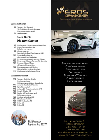 meine-region.ch Inhalt 3Aktuelle Themen%u0009 85%u0009 Vorwort Urs Clement,%u0009 %u0009 VR-Pr%u00e4sident, Brem & Schwarz Elektroinstallationen AG%u0009 86%u0009 Sanierungen:%u0009 95%u0009 Kaufen statt Mieten %u2013 so macht es Sinn%u0009 97%u0009 Diese Trends pr%u00e4gen die%u0009 %u0009 Schulen von morgen%u0009 99%u0009 Altersvorsorge:%u0009 %u0009 komplizierte Begriffe einfach erkl%u00e4rt%u0009 101%u0009 Gesunde Ern%u00e4hrung %u2013%u0009 %u0009 eine Investition f%u00fcrs Leben%u0009 103%u0009 Es glitzert und funkelt auf den Z%u00e4hnen%u0009 105%u0009 Ein unverzichtbarer Partnerf%u00fcr das Auto%u0009 107%u0009 Der unsichtbare Motor%u0009 %u0009 effizienter Lieferketten%u0009 109%u0009 Energiessparen mit Kindern:%u0009 %u0009 kleine Helden im Umweltschutz%u0009 111%u0009 Die %u00f6kologische Rolle der TiereAus der Berufswelt%u0009 113%u0009 Vorwort Christian Sch%u00e4li,%u0009 %u0009 Regierunsrat und%u0009 %u0009 Stiftungsratspr%u00e4sident SwissSkills%u0009 114%u0009 Amavita Apotheke W%u00fcrenlos%u0009 116%u0009 Spital Limmattal%u0009 118%u0009 Automobil-Mechatroniker/in EFZ%u0009 120%u0009 Haupt + Studer AG%u0009 122%u0009 Sauter AG Kaminfeger und%u0009 %u0009 L%u00fcftungsreinigung%u0009 123%u0009 Confiserie Spr%u00fcngli AG%u0009 124%u0009 Metallbauer/in EFZ%u0009 126%u0009 GRIBI Hydraulics AG%u0009 127%u0009 H%u00f6hn AG%u0009 128%u0009 Dober AGVom Dach bis zum GartenBist Du unser Top-Lehrling 2027? 121